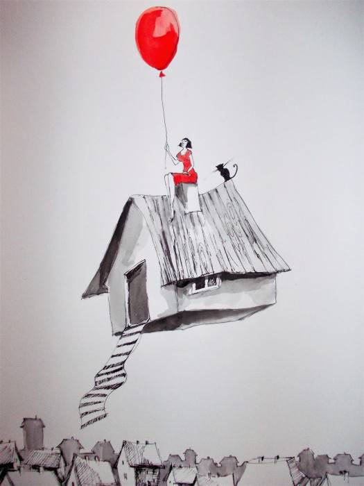 "Latający domek" - akwarela z dodatkiem piórka na papierze A3