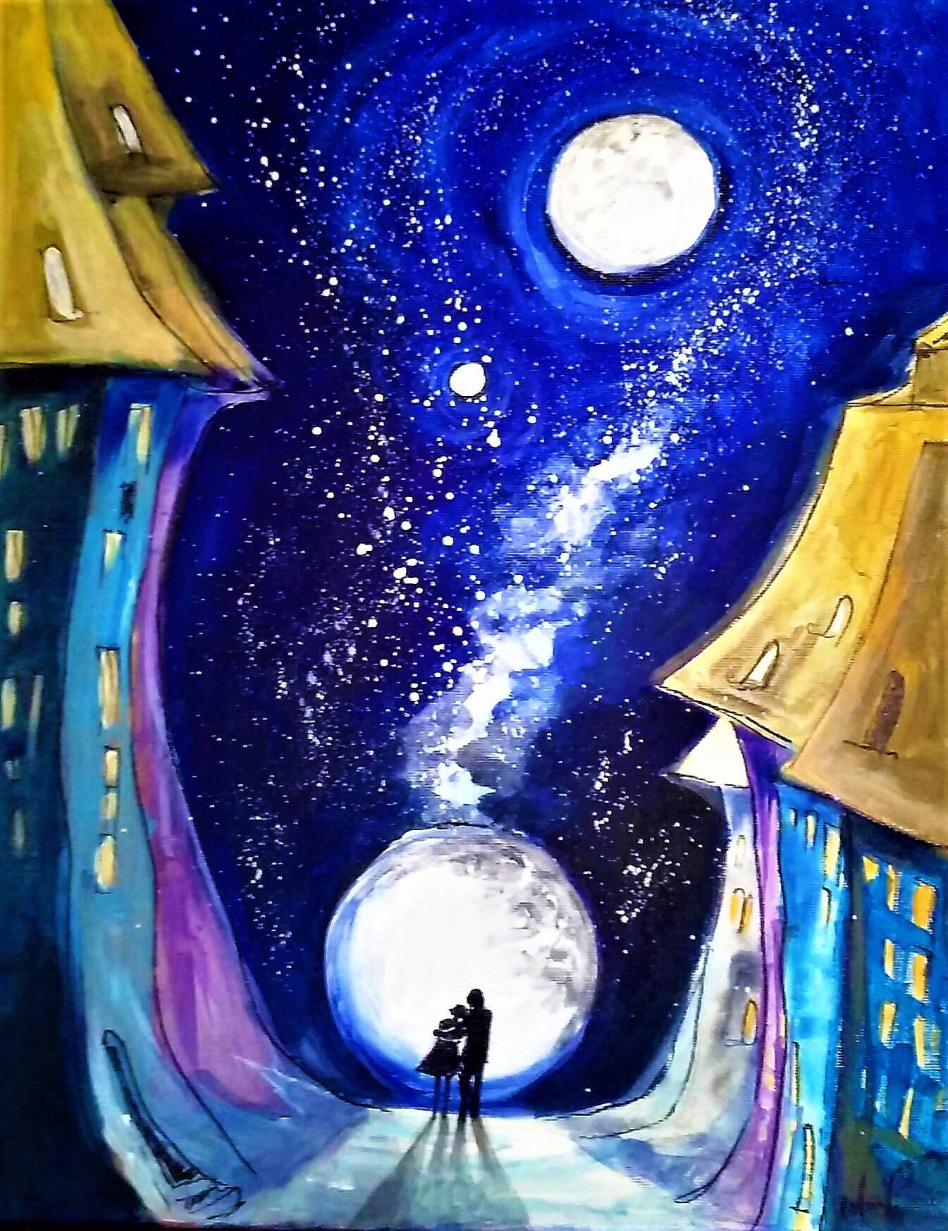 "Inna pełnia" - Obraz ze świata równoległego. Miłość. Akwarela z dodatkiem piórka wykonana na wysokogatunkowym 300g papierze A3. Praca sygnowana, wysyłana w kartonowej tubie.