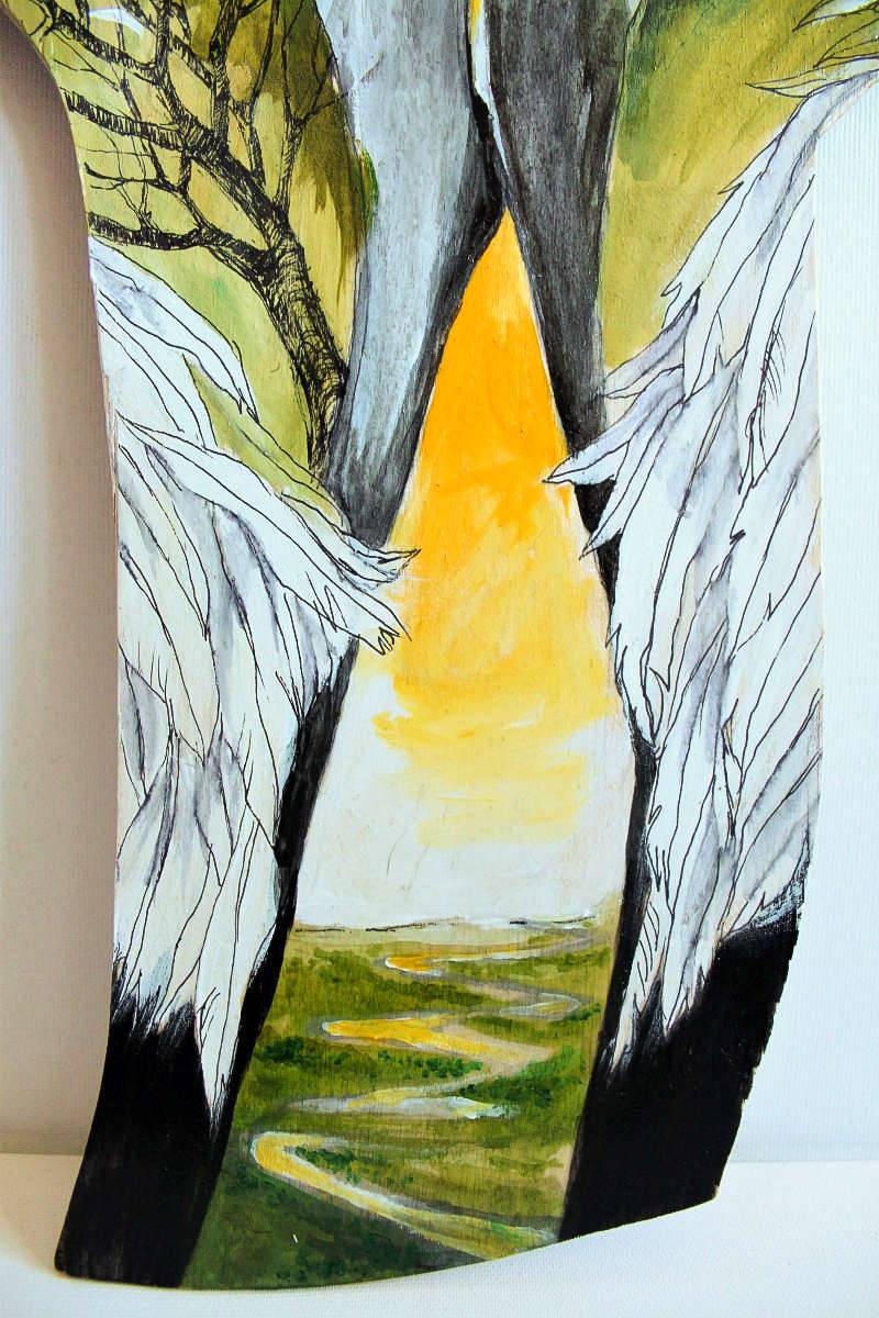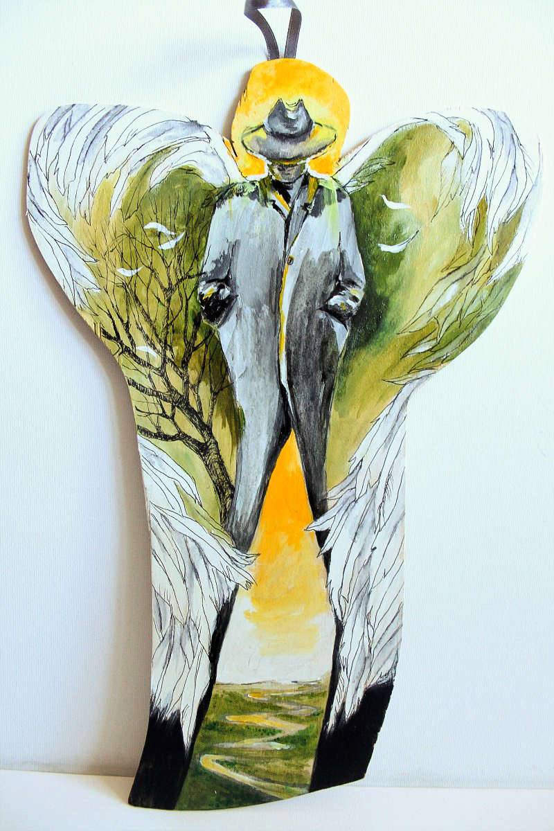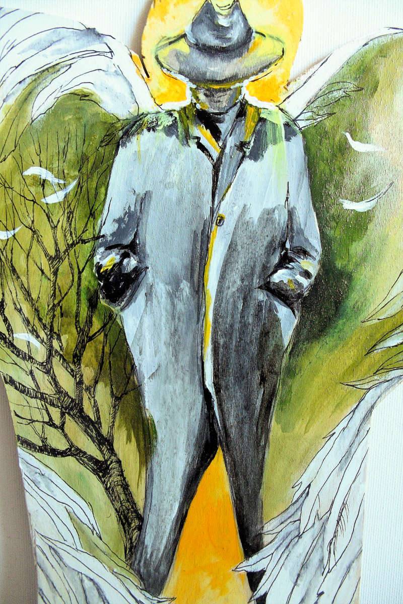 Jedyna w swoim rodzaju ozdoba - obraz namalowany farbami akrylowymi na drewnie ''Anioł drogi''. Wykonany z wielką starannością i dbałością o szczegóły na drewnie w kształcie anioła. Pokryty zabezpieczającym lakierem. Na uroczej pętelce do zawieszenia. Obraz sygnowany. Wspaniale prezentuje się na żywo.