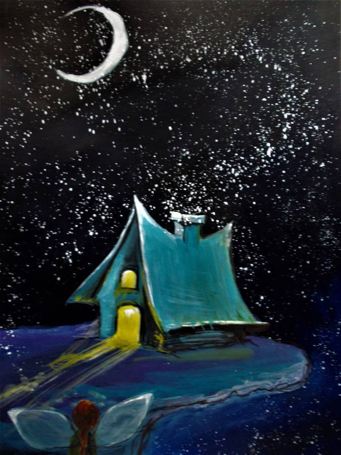 Bajkowy obraz "Domek elfów" wykonany farbami akrylowymi na płótnie 70x50cm. Obraz naciągnięty na blejtram, ma zamalowane boki, sygnowany.