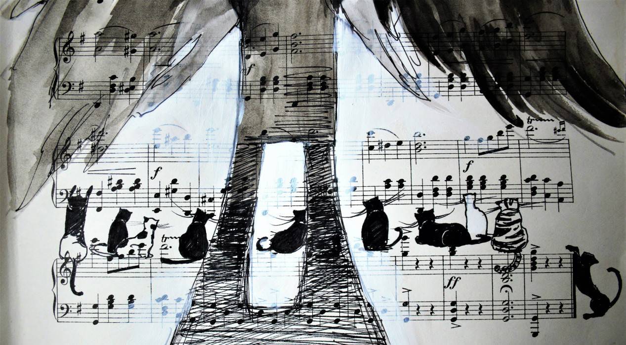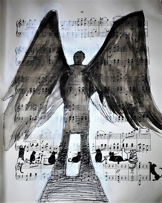 Wyjątkowa akwarela z dodatkiem piórka "Anioł stróż kotów" wykonana na papierze z nutami o wym: 33x25cm. Praca sygnowana, wysyłana w kartonowej tubie.