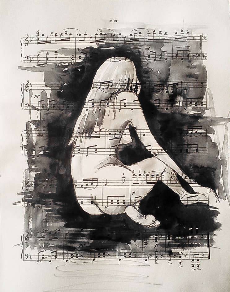 Akwarela "Jestem muzyką 2" wykonana na papierze z nutami o wym: 33x26cm. Praca sygnowana, wysyłana w kartonowej tubie.
