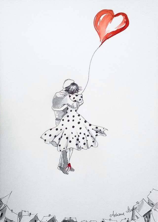 Praca wykonana akwarelami i piórkiem "Z lekkim sercem" na wysokogatunkowym 300g papierze A3. Praca sygnowana.