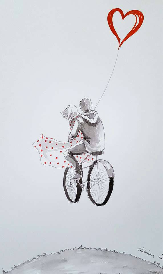 "Z miłością im po drodze" akwarela z dodatkiem piórka wykonana na białym 300g papierze A3 (42cm x 30cm). Praca sygnowana.