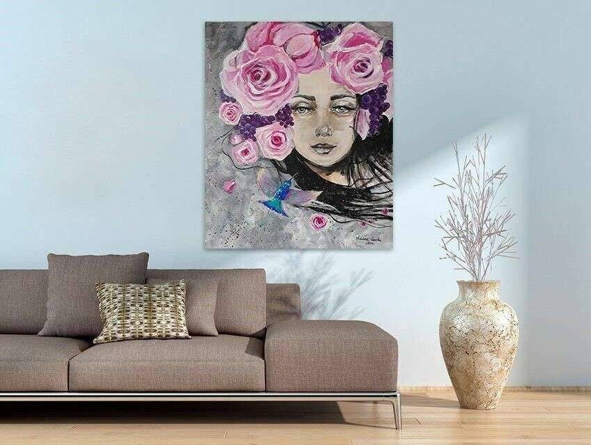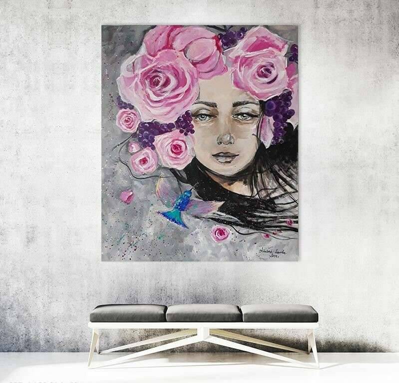"Koliber" obraz wykonany farbami akrylowymi na dużym płótnie o wymiarach 130x110cm. Obraz naciągnięty na blejtram, sygnowany.