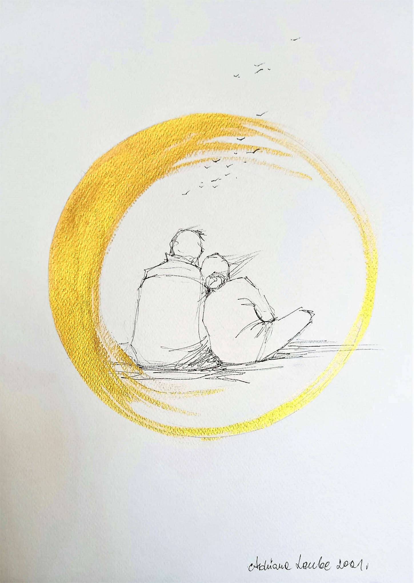 "Na dobre i na złe" obraz piórkiem z dodatkiem złotego tuszu wykonany na białym 300 gramowym papierze A3 (42cm x 30cm). Praca sygnowana.