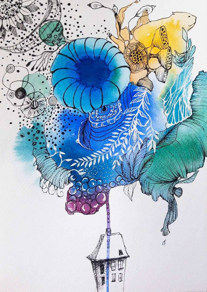 "Sen kamienicy" praca w stylu doodle art wykonana piórkiem oraz farbami akwarelowymi na białym 300g papierze A4 (29,7cm x 21cm). Praca sygnowana.
