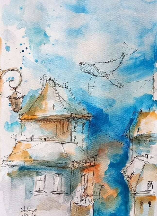 "Patrz w niebo" akwarela z dodatkiem piórka artystki plastyka Adriany Laube wykonana na białym 300g papierze A3 (42cm x 30cm). Praca sygnowana.