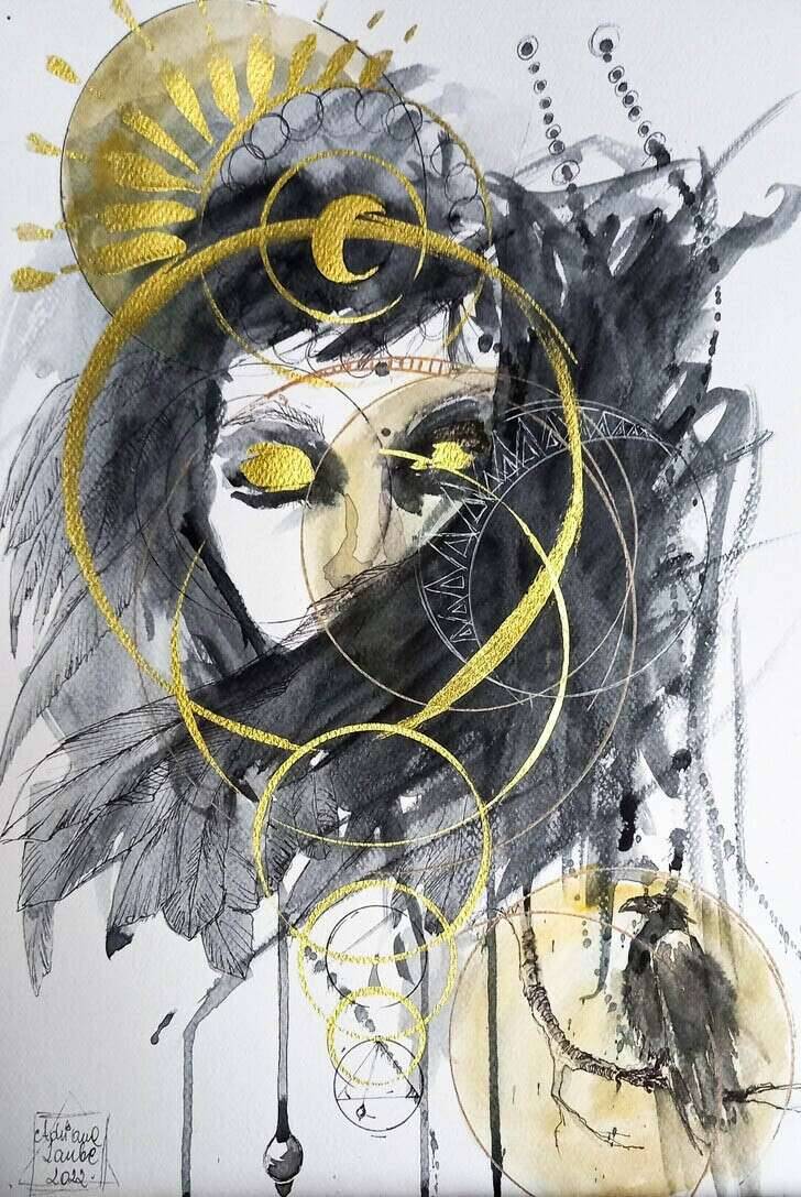 "Przesilenie 2" akwarela z dodatkiem złotego tuszu oraz piórka wykonana na białym 300g papierze A3 (42cm x 30cm). Praca sygnowana.