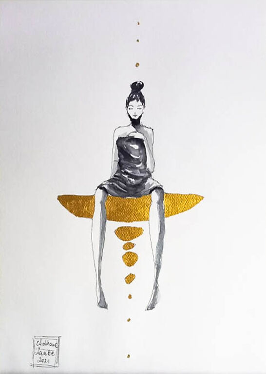 "Zen" akwarela z dodatkiem złotego tuszu wykonana na białym 300g papierze A3 (42cm x 30cm). Praca sygnowana.