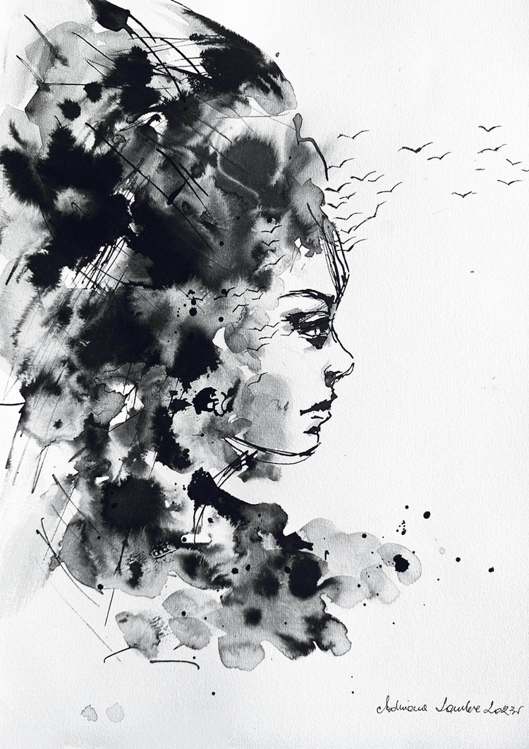 "A myśli jak ptaki..." praca wykonana czarnym tuszem na białym 300g papierze A3 (42cm x 30cm). Praca sygnowana.