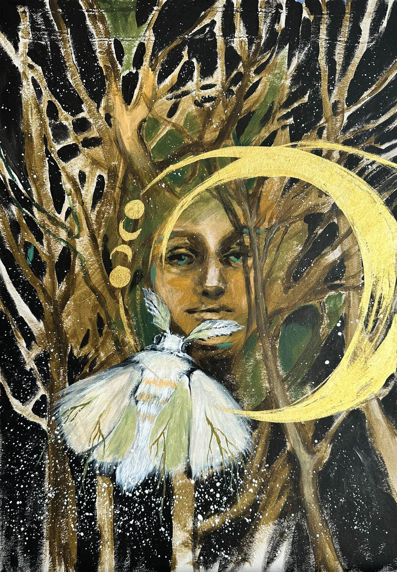 "Driada" obraz wykonany farbami akrylowymi oraz złotym tuszem na tekturze o formacie A2 (59,4cm x 42cm). Praca sygnowana.