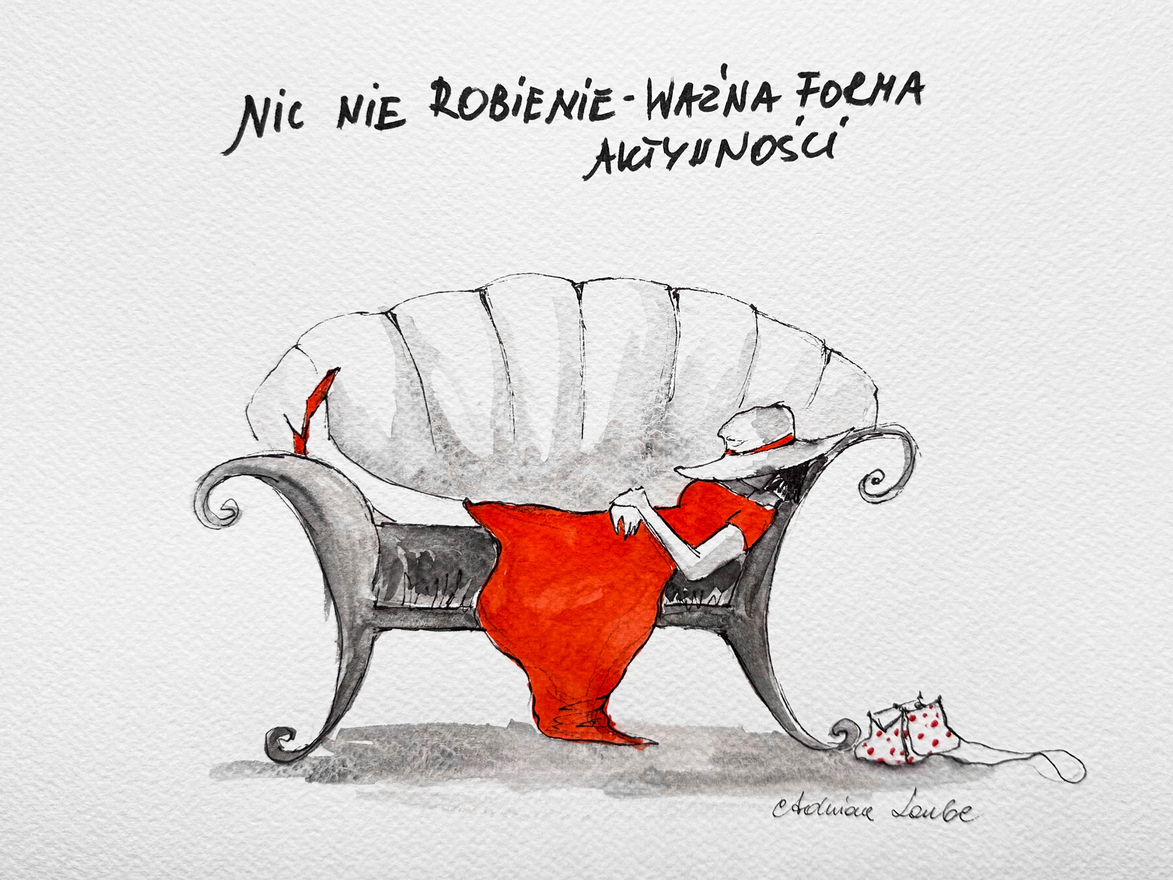 "Nic-nie-robienie" akwarela z dodatkiem piórka wykonana na białym 300g papierze A4 (29,7cm x 21cm) przez artystkę plastyka Adrianę Laube. Praca sygnowana.