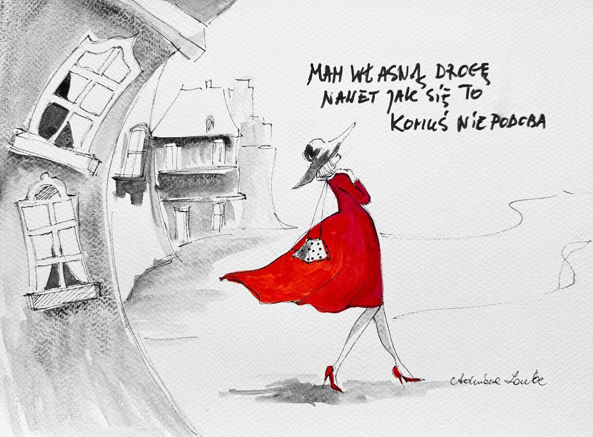 "Mam własną drogę" akwarela z dodatkiem piórka wykonana na białym 300g papierze A4 (29,7cm x 21cm) przez artystkę plastyka Adrianę Laube. Praca sygnowana.