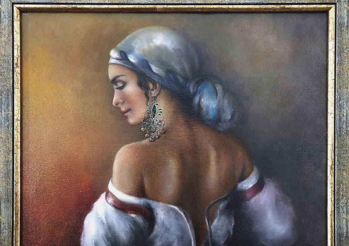Obraz pt. "Bizantyjka", wym. 40 x 60 cm, technika mieszana (olej, tempera naturalna - jajowa), 2013-2016. Obraz jest oprawiony, wymiar z ramą: 50 x 70 cm. Oryginał. Stan: bardzo dobry. Obraz pt. "Bizantyjka" jako aspekty nagości i delikatności a zarazem naturalnego ciepła i kobiecej Mocy, dedykuję dla wzmocnienia energii kobiecej, do umieszczenia na ścianie w pobliżu łazienki (nie w samej łazience, aby nie narażać obrazu na wilgoć), lub w sypialni.