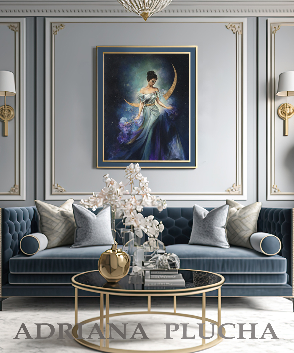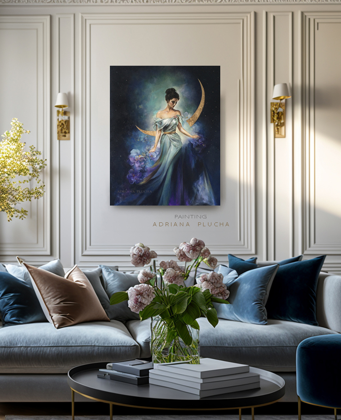 Obraz z kolekcji pt. "Świątynia Ciszy". Głównym tematem jest kobieta i wielowymiarowość jej natury. Księżyc na obrazie pokryty jest antycznym złotem w płatkach 23 karaty. Specyfikacja: "Księżycowa noc", złoto antyczne w płatkach 23 karaty TH 14, 92x73 cm, olej na płótnie, 2024. Tutaj kupują Państwo obraz z czystym złotem w płatkach 23 karaty, a nie złotą farbą.