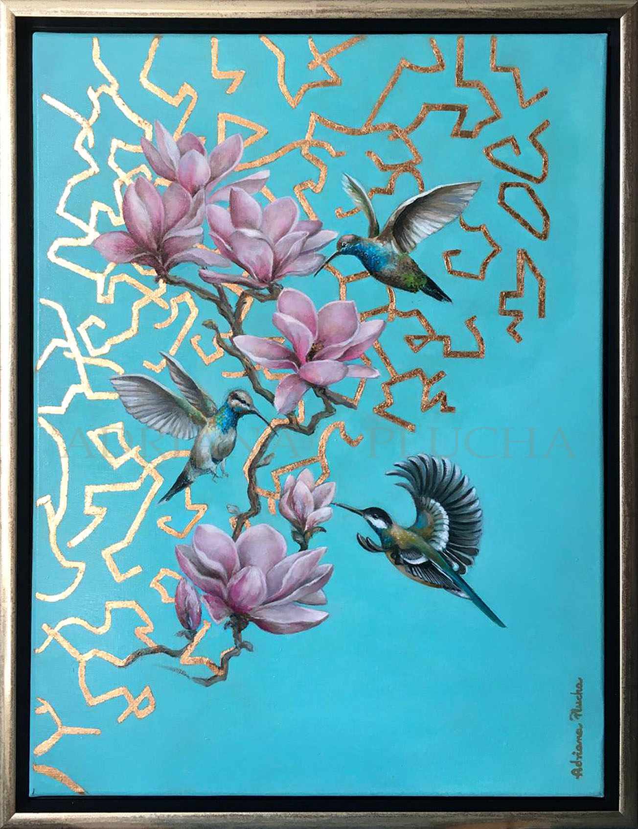 Pejzaż "Harmony in the Air" III, czyli baleriny powietrza :-) Akryl, olej, szlagmetal, wymiary: 61x46 cm, w ramie 66x51 cm. Odcień tła obrazu: błękitno-turkusowy, w zależności od oświetlenia oraz ustawień ekranu/monitora. Zdjęcia zostały zrobione w świetle naturalnym w pomieszczeniu. ----- Aktualnie obraz oprawiony jest w ramę "american box" i jest gotowy do zawieszenia. ----- Painting with gilding foil.