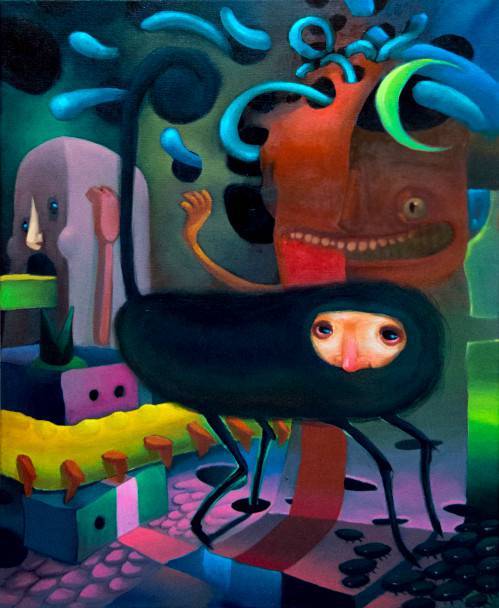 Ten obraz jest jak wzięty z kolorowego snu (lub, dla niektórych, dziwnej koszmaru). Dominują tu nasycone barwy: mocne zielenie, jaskrawe błękity i intensywne różowe odcienie, które przeplatają się w fantazyjnych, surrealistycznych kształtach. Centralną postacią jest czarna, enigmatyczna postać z oczami, które wydają się spoglądać prosto w duszę obserwatora. Wokół niej tańczą figury, które przypominają stworzenia, ale jednocześnie coś zupełnie odrealnionego. Atmosfera obrazu jest tajemnicza i nieco niepokojąca. Mieszanka humoru i grozy nadaje kompozycji niezwykły klimat. Styl artysty przywodzi na myśl surrealizm, a jego technika wodzi odbiorcę na granicy jawy i snu. Obraz może wywoływać mieszane uczucia - z jednej strony fascynację, z drugiej lekkie zaniepokojenie. Ktoś mógłby powiedzieć "Wow, that's crazy!" i miałby rację. I chyba każde dziecko by powiedziało, że to dziwne potwory są tu super ciekawe. Moje osobiste odczucia? To jakby umysł miał wizualną imprezę. Świetnie oddaje dynamikę chaosu, ale w taki sposób, że nie można odwrócić wzroku. Co myślicie?