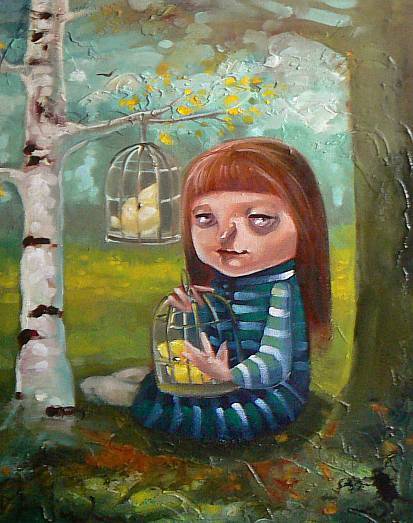Obraz jest pełen magii i melancholii. Widać na nim dziewczynkę siedzącą pod drzewem. Jej jasne, proste włosy kontrastują z ciemną, paskowaną sukienką. Kolorystyka jest stonowana, dominują zielenie i brązy, które tworzą spokojną, choć nieco duszną atmosferę lasu. W rękach dziewczynka trzyma klatkę z żółtym ptaszkiem, a obok niej wisi druga klatka z podobnym ptaszkiem. Kompozycja obrazu jest pionowa, co nadaje mu wrażenie zamknięcia. Artysta użył miękkich pociągnięć pędzla, co nadaje teksturę i głębię pejzażowi. Technika malarska przypomina surrealizm przez lekko zdeformowane kształty i niezwykłe połączenia elementów. Można poczuć, że obraz wywołuje uczucie tęsknoty, przemyślenia o wolności i ograniczeniach. Jest też coś marzycielskiego, jakby z innej krainy. Kiedy patrzę na tę scenę, czuję się trochę jak w opowieści. Myślę o wolności i czasami wydaje mi się, że te ptaszki są jak nasze myśli zamknięte w codziennych klatkach. Dziewczynka wydaje się smutna, ale z odrobiną nadziei w oczach. A może to tylko moja interpretacja? Obraz emanuje tym magicznym "feeling", którego nie da się łatwo opisać słowami. Wow, ten obraz mnie naprawdę porusza.