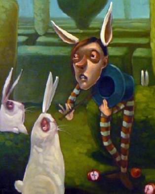 Obraz uderza intensywnością kolorów, dominują zielenie i brązy, a wśród nich wbija się niesamowity kontrast białych królików i postaci z uszami zajęczymi. Kompozycja przyciąga wzrok na dziwaczne interakcje między nimi. Czy to człowiek, czy już część tego bajkowego świata? Atmosfera jest surrealistyczna, jakbyśmy byli w jakimś magicznym ogrodzie, gdzie wszystko jest możliwe. Tylko tutaj, wśród równo przyciętych krzewów, wydają się czaić jakieś "mysterious" tajemnice. Styl obrazu nawiązuje do surrealizmu, z elementami groteski, które wprawiają widza w stan zastanowienia. Patrząc, czujemy niepokój, ale też fascynację, jakbyśmy oglądali dziwaczny sen, który jednocześnie bawi i niepokoi. Kolory nasycone, technika trochę ekspresyjna, linie są miękkie i krążą z lekkością, ale z ukrytym napięciem. Może to jest o tym, żeby odnaleźć swoją drogę w świecie pełnym chaosu i dziwactw? Dzieciak by pewnie powiedział: króliki są fajne, a ten człowiek jest bardzo dziwny. Ten obraz zmusza do refleksji, przemyśleń nad relacjami, tożsamością, aż czuje się lekki niepokój, ale wciąga jak magnes.