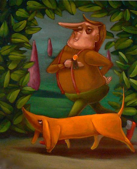Na obrazie widać mężczyznę dumnie kroczącego z psem przez zielony tunel z liści. Ubrany w brązowy sweter, zielone spodnie i czerwone szelki, emanuje pewnością siebie. Jego nos przypomina kształtem rzymskie popiersia, dodając mu nieco komicznego wyrazu. Pies ma długie uszy i jest intensywnie pomarańczowy, kontrastując z otaczającą zielenią. Tło to stonowane pastele, zółty i różowe smugi, które dodają obrazu bajkowej atmosfery. Nastrój obrazu jest radosny, lekko surrealistyczny. Czujemy beztroskę spaceru, jakby świat wokoło to tylko teatr. Styl przypomina trochę kreskówkową estetykę, z wyraźnymi liniami i zaokrąglonymi formami. Technika malarska nawiązuje do realizmu z nutką abstrakcji, sprawiając, że całość jest dynamiczna i zabawna. To obraz, który może wywołać uśmiech i skraść serce, przypominając nam chwilę dzieciństwa, gdy wszystko wydawało się prostsze. Jak mówiłby 7-latek: „Pan i pies wyglądają jak najlepsi przyjaciele na zawsze.” Może to właśnie ten simplicity i zestawienie humoru z codziennością sprawiają, że czujemy się, jakbyśmy oglądali scenę z bajki. Słowo magic idealnie pasuje, by oddać ten czarujący klimat. Obraz nie tylko przedstawia scenę, ale też zabiera nas w podróż do świata, gdzie wszystko jest możliwe.