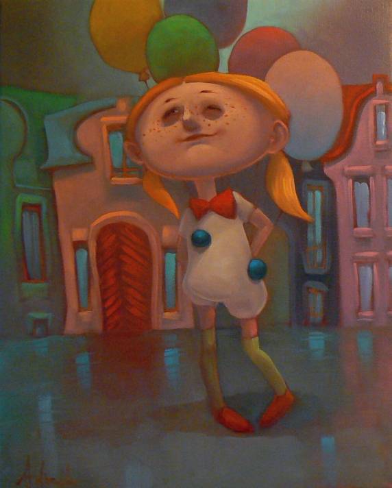 Na obrazie widzimy postać dziecka o rudych warkoczykach, które dumnie stoi przed kolorowymi kamienicami. Intensywne barwy — pomarańcz, zieleń i błękit — wypełniają przestrzeń, tworząc niemal bajkowy świat. Charakterystyczne, przeskalowane balony w tle unoszą się lekko ponad głową dziecka, dodając kompozycji dynamiczności i radości. Ale coś tu jest szczególnego — może to te piegowate policzki, które sprawiają, że chce się uśmiechnąć. Atmosfera obrazu jest niezwykle lekka, wręcz whimsical, co można przetłumaczyć jako „kapryśna”. Styl artystyczny przypomina trochę mural, z ostrymi liniami i odważnymi kolorami. Techniką użyta przez artystę zdaje się być mieszanka akrylu z delikatnym dotknięciem pasteli, tworząc efekt miękkich przejść i gładkiej tekstury. Dziecko zdaje się być pełne pewności siebie, niemal jak superbohater w królestwie dziecięcej wyobraźni. „Pewnie, że dam sobie radę!”— mogłoby powiedzieć, cały czas patrząc z przekonaniem w przyszłość. Patrząc na obraz, można poczuć się niemal przeniesionym do krainy marzeń. Ta kompozycja jest tak żywa, że przemawia do dziecka w każdym z nas, przypominając o sile wyobraźni. I coś jeszcze, ten luźny styl pisania przypomina mi, jak ważne jest czasem po prostu cieszyć się chwilą. Kiedy ostatnio patrzyłeś na świat tak, jak to dziecko?