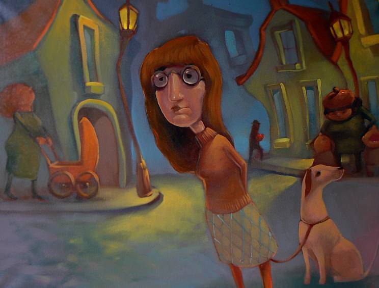 Obraz przedstawia surrealistyczną scenę miejską. Dominuje paleta stonowanych kolorów, które przechodzą od ciepłych pomarańczy po chłodne, niebieskie cienie. W centrum postać z nieporównywalnie dużymi oczami i wyrazem twarzy, który ciągle się zastanawia. Nie wiadomo, czy zaraz się rozpłacze, czy śmignie z uśmiechem na twarzy. Obok niej stoi pies na smyczy, patrząc gdzieś w nieokreśloną dal. Kształty są nieco zniekształcone, lekko kubistyczne, co nadaje obrazowi dreamlike quality. Cała scena jest otoczona przez osobliwe budynki - czyżby to była bajkowa kraina? Lampy uliczne przysłaniają twarze przechodniów, tworząc tajemniczą atmosferę wieczoru. Może to zwykły dzień w niezwyczajnym mieście. Technika sprawia wrażenie niedbałej precyzji, pociągnięcia pędzla są widoczne, jakby artysta chciał zatrzymać ulotną chwilę. Nastrój trochę niepokojący, ale również pełen dziwnej czułości. Obraz przyciąga uwagę, skłaniając do refleksji nad naszym spojrzeniem na świat. Myśli o codzienności, która czasem wydaje się równie surrealistyczna. Może ten pies to tajemniczy towarzysz przygód, a może tylko przypadkowy przechodzień w naszej codzienności. A może to miasto, które z każdą chwilą żyje swoim życiem? Cokolwiek by to nie było, chciałbym tam być i zobaczyć na własne oczy.