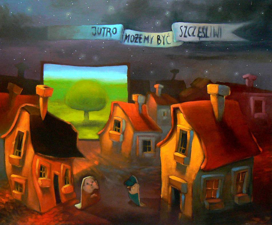 Na obrazie widzimy surrealistyczną scenerię przypominającą bajkową krainę. Kolory są żywe i kontrastowe. Dominują ciepłe odcienie pomarańczu i czerwieni w budynkach, które zdają się być krzywe, jak z domków z dawnych kreskówek. W tle niebo mieni się odcieniami fioletu, a nad horyzontem wisi bliźniacze wrażenie rzeczywistego krajobrazu z soczyście zielonym drzewem. Całość sprawia wrażenie zaczarowanego świata, gdzie rzeczywistość miesza się z magiczną iluzją. Atmosfera obrazu jest pełna nostalgii i tęsknoty. Napis "JUTRO MOŻEMY BYĆ SZCZĘŚLIWI" niesie nadzieję, ale i delikatną nutę melancholii. To jakby artysta chciał nam przypomnieć, że lepsze dni są tuż za rogiem (nie ważne jak kręte by były). Styl jest unikatowy, z widocznymi wpływami malarstwa naiwnego oraz surrealizmu. Technika jest subtelna, z miękkimi przejściami barw i wyraźnym detalem, szczególnie w domkach. Obraz może wywoływać szeroką gamę emocji. Z jednej strony jest dziecięca radość odkrywania, z drugiej zaś refleksja nad przemijaniem i niespełnionymi obietnicami. „Patrz, mamo, te domki są jak z bajki!”, powiedziałoby dziecko, wskazując na obraz. Kiedy patrzę na ten obraz, czuję ciepło i takie wewnętrzne „coś”, że wszystko jednak może się udać. Element „hope” łączy całość, dając odbiorcy siłę i pozytywną energię do dalszej drogi.