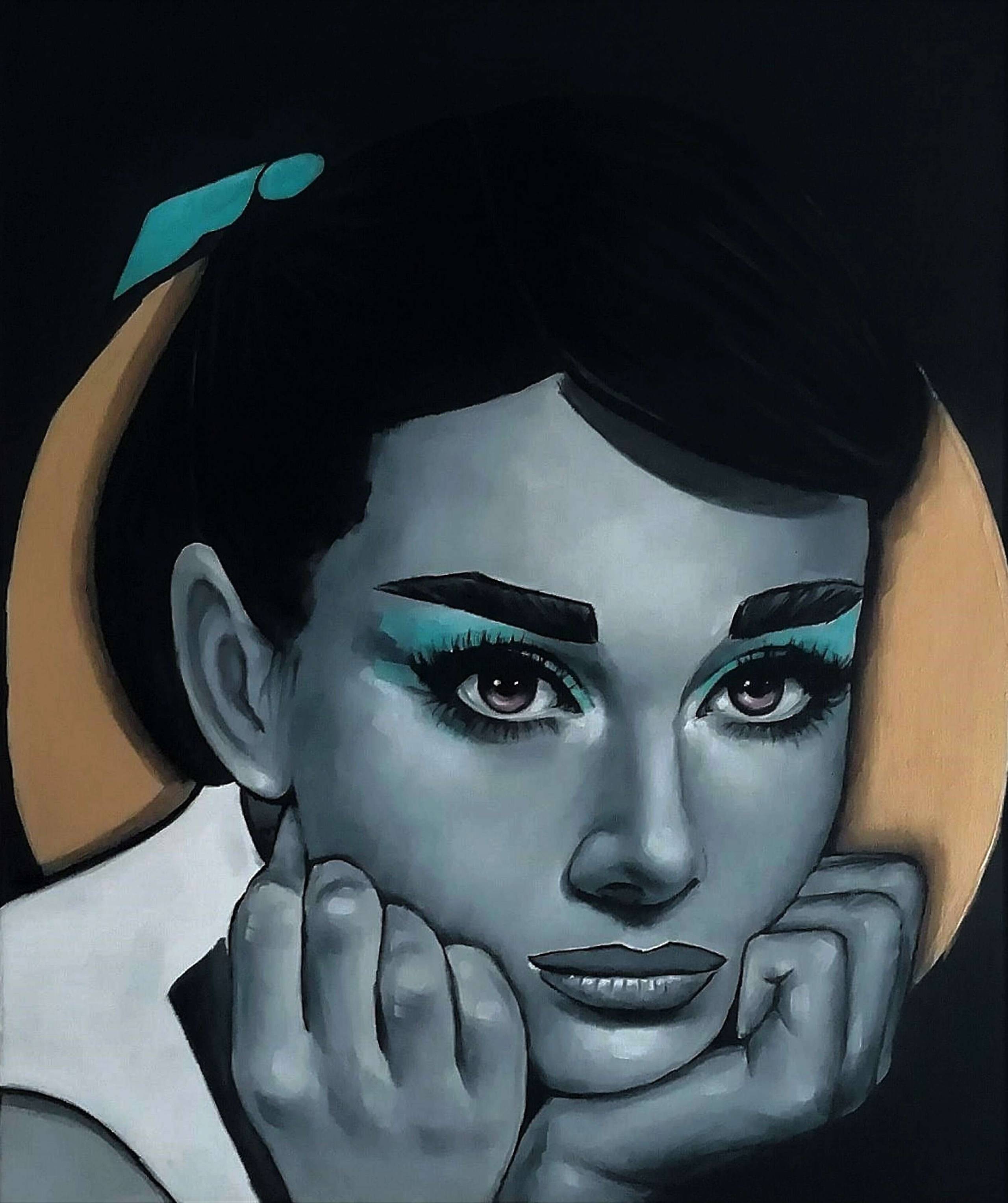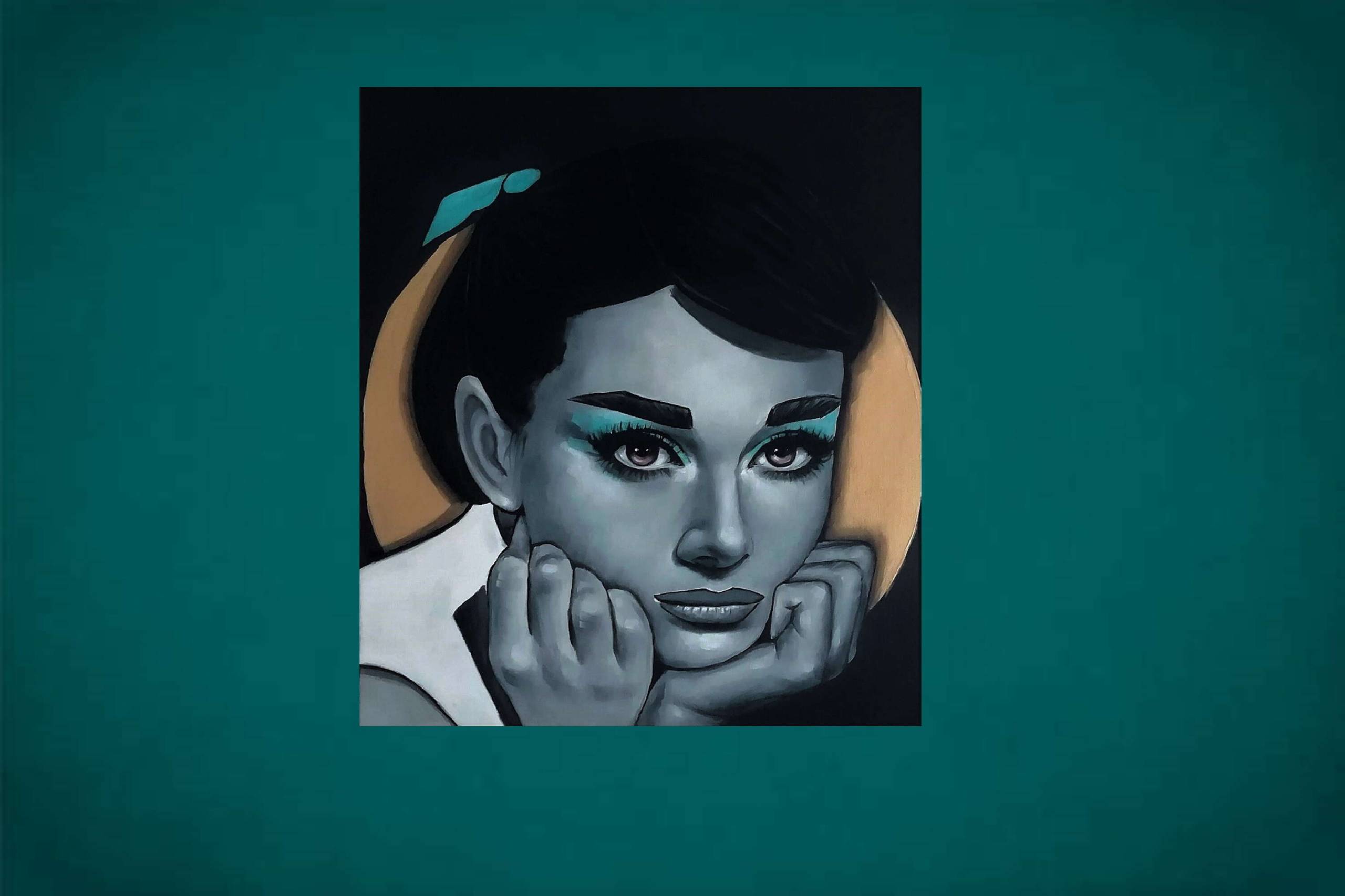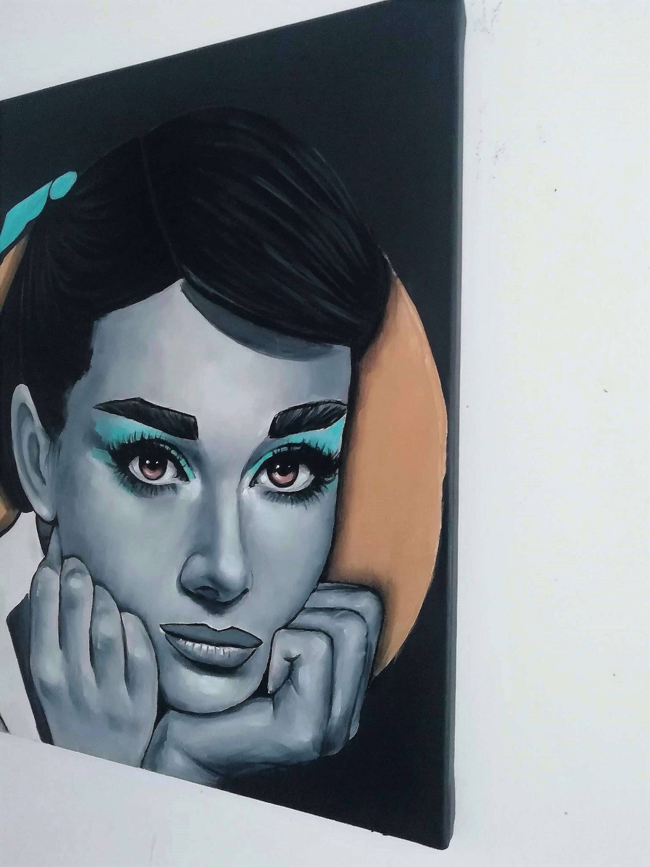 Portret Audrey Hepburn. Obraz wykonany techniką mieszaną (akryl+olej) na płótnie. Użyłam czerni i bieli oraz złotej farby w tle. Kolory w rzeczywistości mogą wyglądać troszkę inaczej niż na zdjęciach. Obraz jest gotowy do powieszenia.