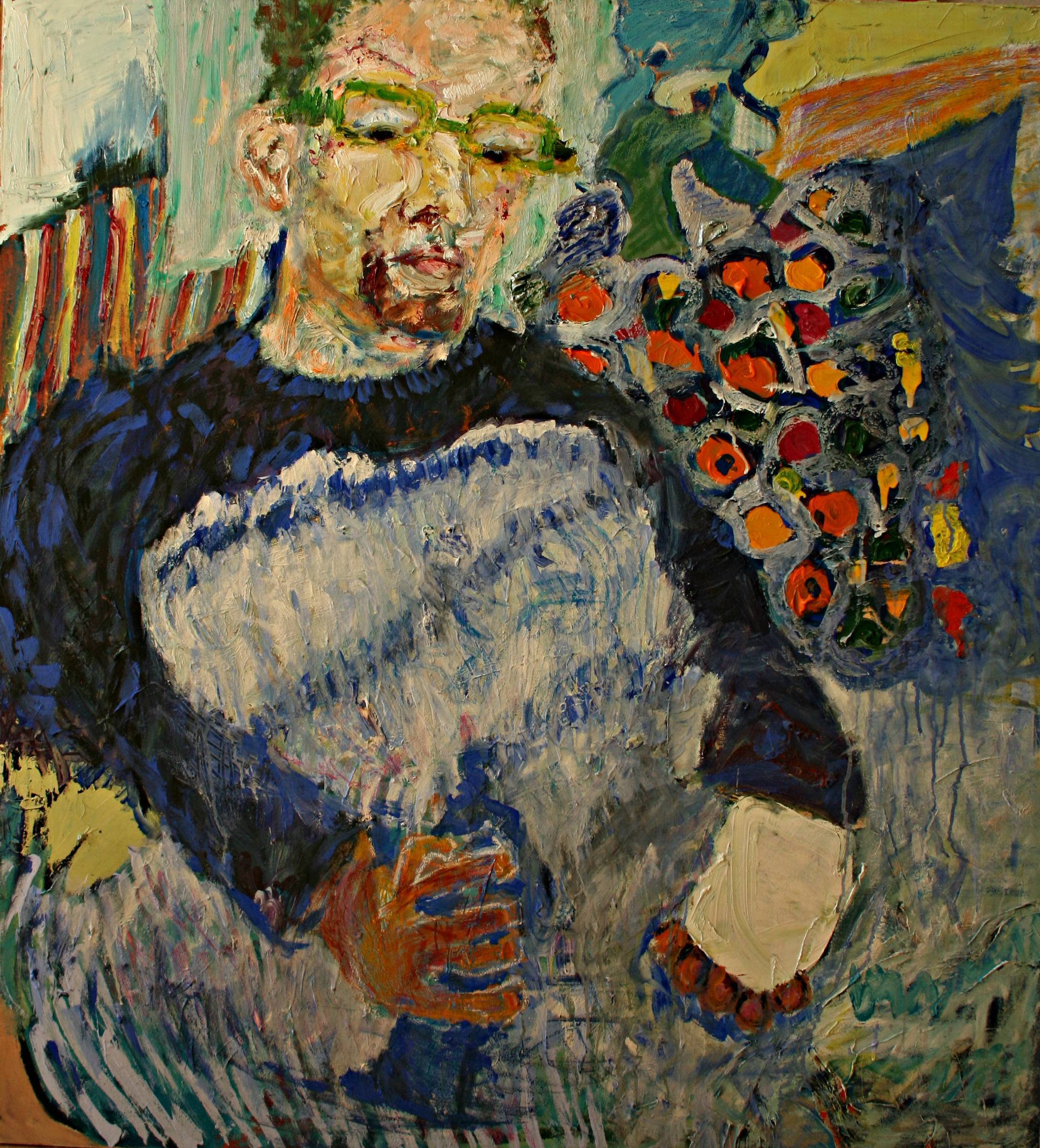 Na obrazie widać feerię barw, gdzie dominują odcienie niebieskiego i pomarańczowego, przeplatane zielenią i czerwienią. Postać na pierwszym planie, może nieco nieszablonowa, ma twarz wyrazistą, choć nieco rozmytą, jakby zatopioną w własnych myślach. Z boku zauważysz jakbys bukiet kolorowych kwiatów. Całość kompozycji jest dynamiczna przez grubo nakładane pociągnięcia pędzla. Przyciąga uwagę jak wirujący taniec kolorów. Atmosfera jest nieco nostalgiczną, ale też pełną energii. Styl artystyczny sugeruje inspiracje ekspresjonizmem, z widocznym, odważnym użyciem tekstur. Może to wywołać emocje takie jak intryga czy zaskoczenie u odbiorcy. Czuć w tym chaosie pewną harmonię, jakby chaos and order były w równowadze. Niektórym może przypominać dzień pełen emocji i dźwięków. "A może ta osoba myśli o cukierkach?" powiedziałoby dziecko, patrząc na kolorowy zawrót głowy. Obraz prowokuje do refleksji, skłania do zastanowienia się nad wewnętrznym światem postaci, jaki to artysta chciał nam pokazać.