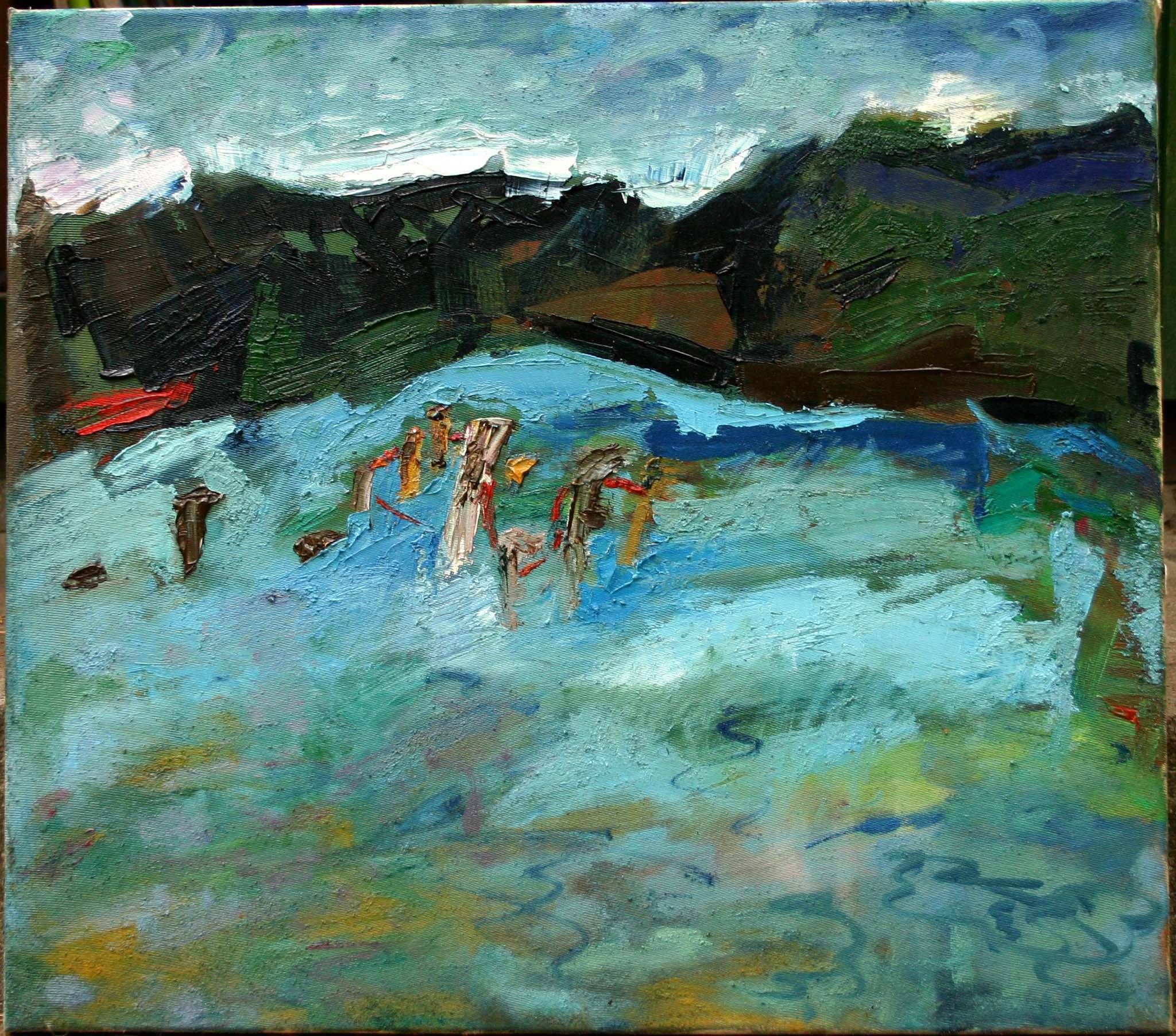 Obraz emanuje dzikością i dynamiką, przenosząc nas do świata pełnego żywiołów. Dominują tu głębokie odcienie niebieskiego i zieleni, które zdają się mieszać i tętnić życiem. Linie są pełne energii, szarpane, niemal chaotyczne, a tekstura farby dodaje głębi i złożoności. Sposób w jaki artysta nakładał farbę, tworząc widoczne ślady pędzla, daje poczucie ruchu, jakby sama natura chciała nas przytulić swoim urokiem. Atmosfera jest trochę tajemnicza, z nutką powagi i nieokiełznanej energii. Styl obrazu można określić jako ekspresjonistyczny, z domieszką abstrakcji. Pewne elementy mogą przypominać krajobraz lub scenę wodną, ale pozostawiają wiele miejsca dla wyobraźni. ‘Wow, ale fajny!’ – tak, powiedziałoby dziecko. Elementy wizualne zachęcają do chwili zatrzymania się i podjęcia refleksji nad tym, co widzimy. Każdy kolor i kształt wydaje się kryć własną historię, nieco krzykliwą, a jednocześnie subtelną. Oglądając to dzieło, można poczuć wewnętrzne poruszenie, może nawet lekkie zamieszanie. To "chaos w porządku," który pobudza zmysły i sprawia, że chce się patrzeć dłużej, głębiej. Obiecuje przygodę, której koniec nie jest jasny ani przewidywalny.