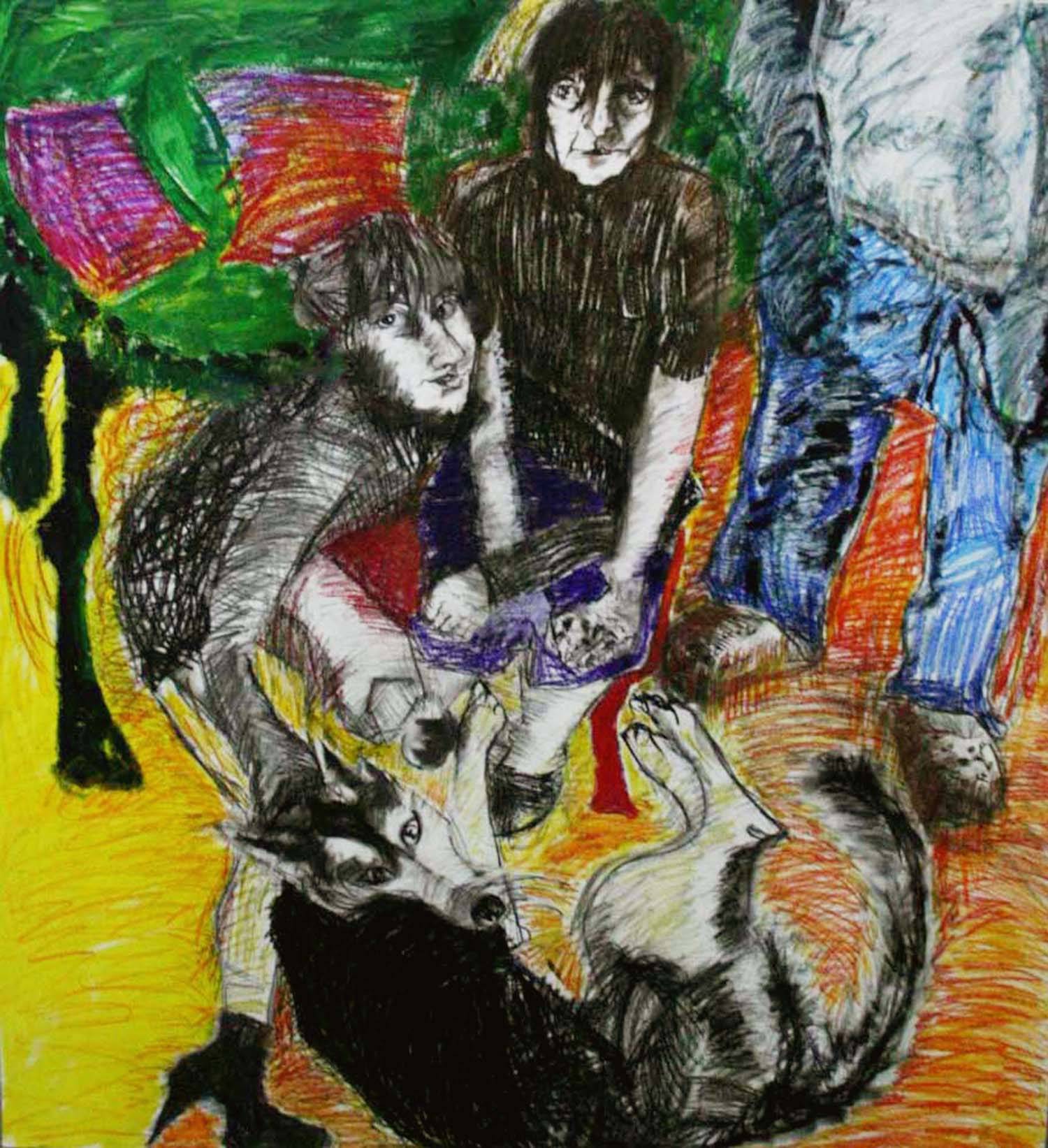 Na obrazie dominują żywe kolory, takie jak zielenie, żółcie i czerwienie, które kontrastują z ciemnymi, niemal monochromatycznymi sylwetkami postaci. Centralną część dzieła zajmują dwie postacie oraz pies, które zdają się emanować tajemniczym, nieco niepokojącym nastrojem. Ich spojrzenia są intensywne i jakby zamglone, a czerń ich ciał odznacza się na tle jaskrawych barw otoczenia, tworząc intrygującą kompozycję przypominającą chaos codzienności. Artysta posługuje się techniką kreski, która nadaje obrazowi dynamiczny i surowy charakter, a jednocześnie – to jest fajne – daje wrażenie ruchu i życia. Patrząc na obraz, można poczuć mieszankę zaniepokojenia i fascynacji. Widz zastanawia się, jakie emocje skrywają się za czerniami i czy te postacie są częścią większej historii. Moja młodsza siostra powiedziałaby: "Piesek wygląda na smutnego!". Styl obrazu łączy elementy ekspresjonistyczne z surrealizmem, prowadząc odbiorcę w podróż przez własne refleksje i emocje. It's captivating i jednocześnie trochę dziwne, co sprawia, że zatrzymać się przy nim na dłużej.