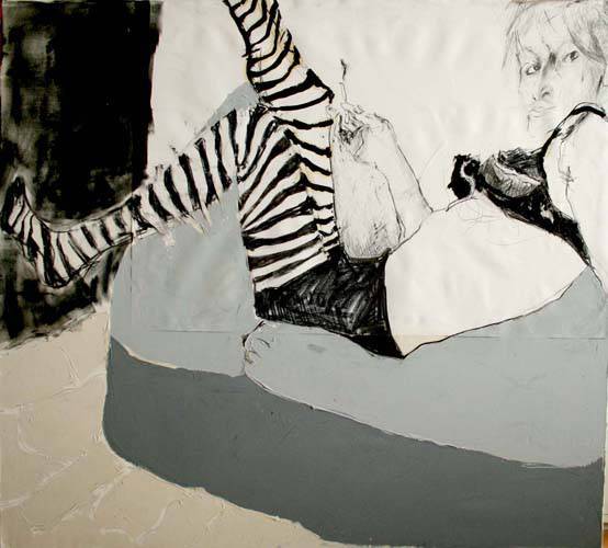 Na obrazie widzimy osobę leżącą na dużym fotelu lub materacu, ubranej w przyciągające uwagę, czarno-białe, prążkowane rajstopy. Cała scena jest utrzymana w stonowanych odcieniach szarości i beżu, z delikatnymi akcentami bieli i czerni. Kształty są miękkie i nieregularne, co nadaje kompozycji lekko abstrakcyjny wyraz. Artysta korzysta z odważnego kreskowania i kontrastów, co przyciąga wzrok i nadaje obrazowi dynamiczny charakter. Atmosfera dzieła jest jednocześnie spokojna i nieco tajemnicza. Nastrój wydaje się być zrelaksowany, ale też introspektywny. Styl artystyczny przypomina mieszankę rysunku i malarstwa, gdzie pociągnięcia pędzla i technika szkicowania łączą się w harmonijną całość. Jest coś osobistego w tej scenie, coś co sprawia, że odbiorca zaczyna snuć swoje własne opowieści. Patrząc na obraz, można poczuć melancholię czy tęsknotę. Może to be a reflection momentu zatrzymania w codzienności, chwili namysłu. Mały piesek spoczywający obok bohatera dodaje ciepła i codziennej zwyczajności. Nogi włożone w prążkowane rajstopy przyciągają najwięcej uwagi i wywołują uśmiech – jakby ktoś chciał pokazać trochę humoru w tej spokojnej scenie. Hej, a ta osoba wygląda, jakby się fajnie bawiła! Ten obraz to jakby fragment opowieści o kimś, kto znalazł moment dla siebie, a my mamy okazję być świadkami tej intymności. Emocje, które emanują z tego dzieła, są subtelne, a jednak niezwykle wymowne. Każdy może odebrać ten obraz na swój sposób, ale jedno jest pewne – trudno przejść obok niego obojętnie.