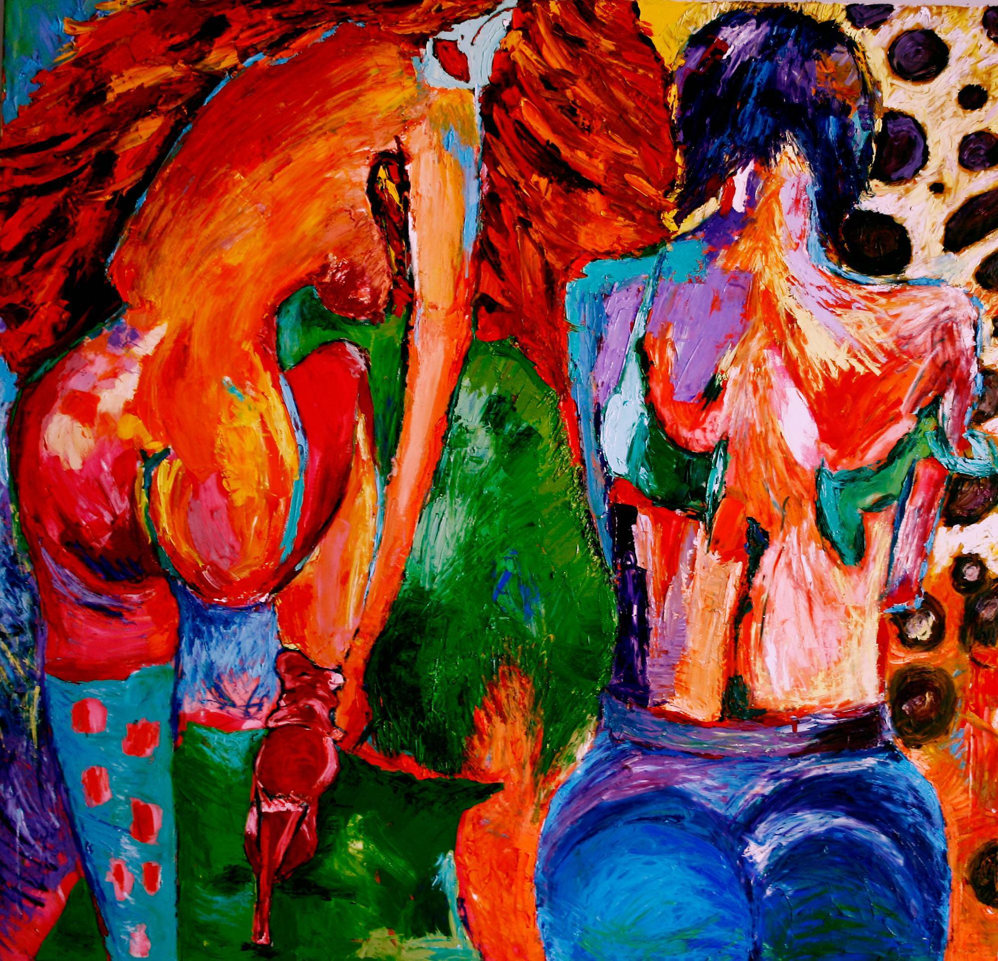 Obraz emanuje energią i emocjami dzięki intensywnym barwom, które wręcz wybuchają na płótnie. Krzykliwe czerwienie i pomarańcze mieszają się z chłodniejszymi odcieniami niebieskiego i zieleni, tworząc dynamiczne kontrasty. Dwie sylwetki ludzkie, o rozmytych konturach, zdają się wirować w namiętnym tańcu życia. Kompozycja pełna jest ruchu i ekspresji, co sprawia, że każda linia i plama koloru żyją własnym rytmem. To jak jazz, improwizacja doznania kolorów. Atmosfera jest pełna zmysłowości i dzikości. Zdaje się, że postaci przechylają się w stronę siebie, a uczucia między nimi są niemal namacalne. Artysta korzysta z palety szerokich pociągnięć pędzla, nadając teksturze obrazu żywiołowy charakter. Technika przypomina ekspresjonizm, gdzie emocje są ważniejsze niż realistyczne odwzorowanie rzeczywistości. Dla odbiorcy dzieło to może być inspiracją do refleksji nad miłością i wolnością. Dzieciak mógłby zawołać: “Kolory są takie fajne!” Patrząc na obraz, czuję, że artysta chciał przekazać nam fragment swojego “dream”. Obraz porusza głęboko ukryte emocje, budząc w nas coś pierwotnego i uniwersalnego. Każda chwila spędzona na obserwacji odkrywa nowe warstwy znaczeń, tworząc podróż przez wewnętrzny świat emocji.