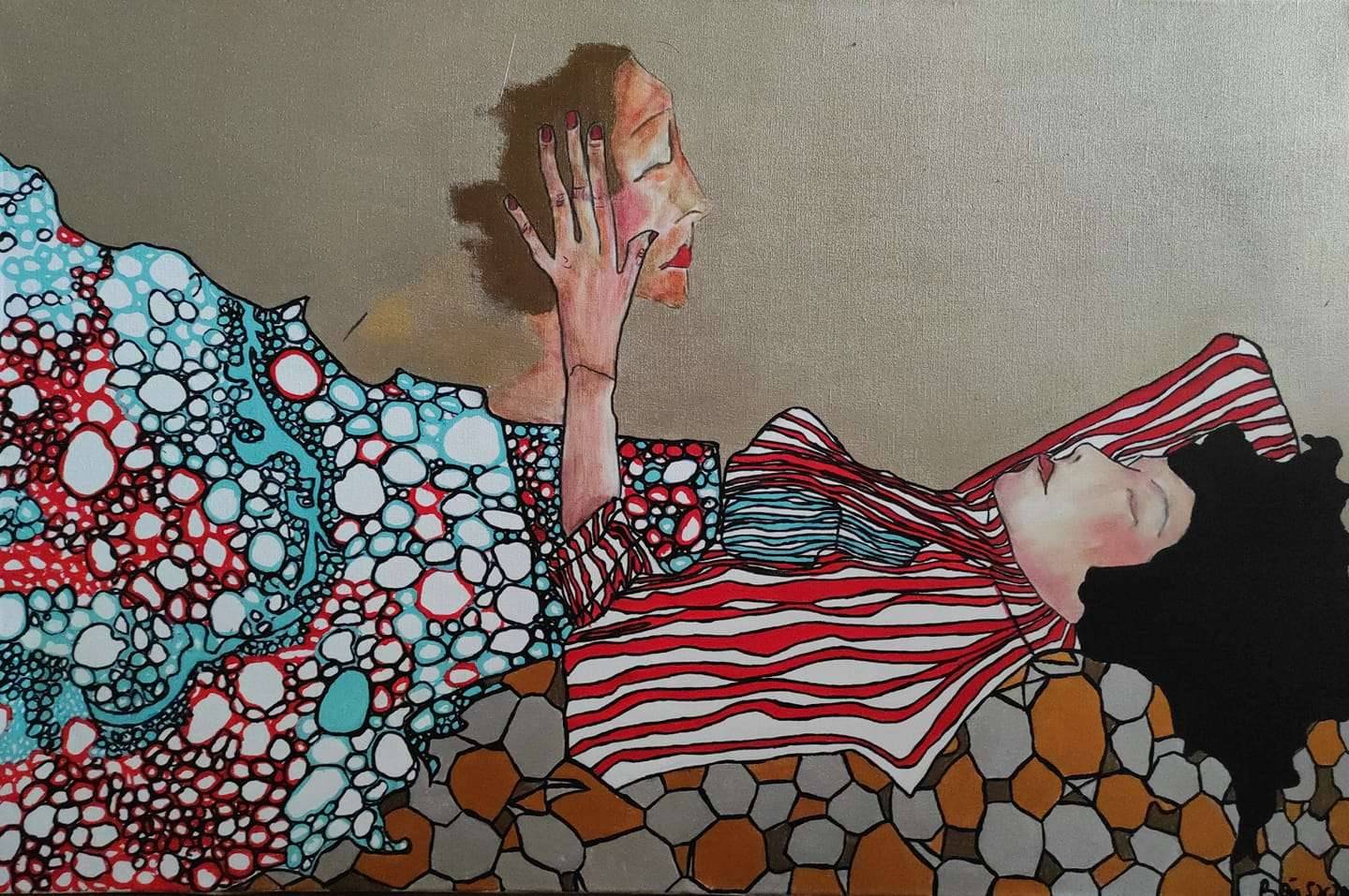Obraz przyciąga wzrok różnorodnością kolorów i form. Z lewej strony dominują bąbelki w odcieniach niebieskiego i czerwonego, tworząc dynamiczną, niemalże baśniową teksturę. Postać leżąca po prawej, ubrana w pasiasty strój, zdaje się głęboko śnić, a jej spokojna twarz kontrastuje z otaczającym ją chaosem barw. Całość kompozycji jest przemyślana, a linie wyraźnie podkreślają rysy twarzy i kontury ciała, nadając pracy surrealistycznego charakteru. Atmosfera obrazu jest tajemnicza i medytacyjna, jakby czas przestał istnieć. Artysta bawi się techniką collage, łącząc różne style i techniki malarskie. W niesamowity sposób oddaje poczucie oderwania od rzeczywistości i zatopienia w marzeniach. Może budzić w odbiorcy uczucia nostalgii albo spokoju. Kiedy patrzę na ten obraz, czuję się jakbym zaglądała do cudzego snu. Takie podejście "outside the box" robi naprawdę duże wrażenie. Dzieciak powiedziałby: "Ona śni o bańkach mydlanych i ciastkach". Obraz emanuje ciepłem i jednocześnie puszcza wodze wyobraźni, zmuszając do przemyśleń nad ulotnymi chwilami w życiu.