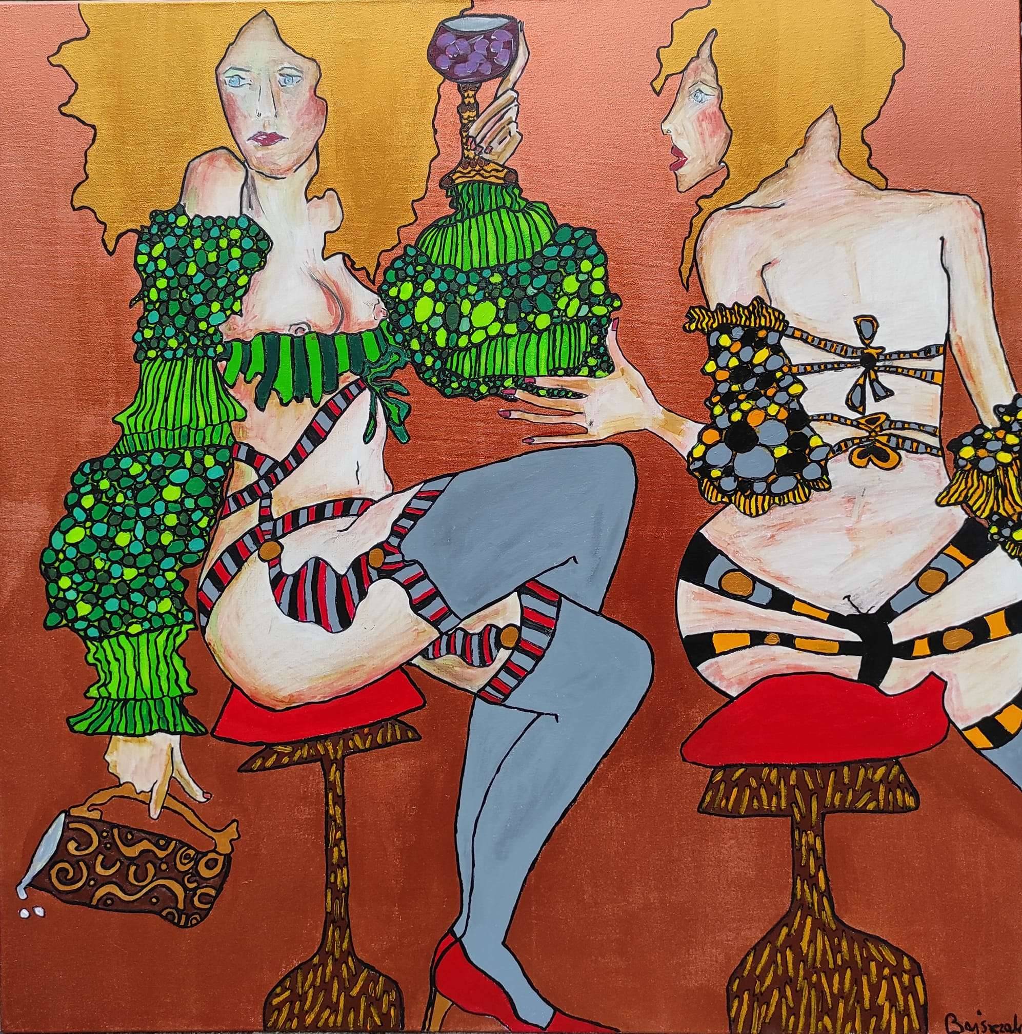 Na tym obrazie widzimy dwie postacie osadzone w bogatej palecie kolorów, gdzie dominują zielenie, rudości i intensywne błękity. Postacie siedzą na czerwonych siedziskach, a ich sylwetki są wyraziste i pełne różnych wzorów - od geometrycznych pasków po kropki. Kompozycja jest dynamiczna, z postaciami zwróconymi do siebie, jakby prowadziły tajemniczą rozmowę. Atmosfera obrazu jest trochę surrealistyczna, z nutą swobodnej, artystycznej nonszalancji. Jest w tym coś szalonego, co przyciąga oko. Styl artystyczny przypomina trochę groteskę, z ekstrawaganckimi kształtami i kontrastującymi kolorami. Może nawet comic. Obraz wywołuje emocje ciekawości i zadumy. No bo co one tam robią? Może opowiadają sobie jakieś sekrety. Odbiorca może poczuć lekkie onieśmielenie, ale i zachwyt. Dzieło to intryguje, może nawet trochę bawi. Jak siedzę i patrzę na to, myślę o całkowitej wolności wyrazu autora. Świetne połączenie chaosu i wyrafinowania!