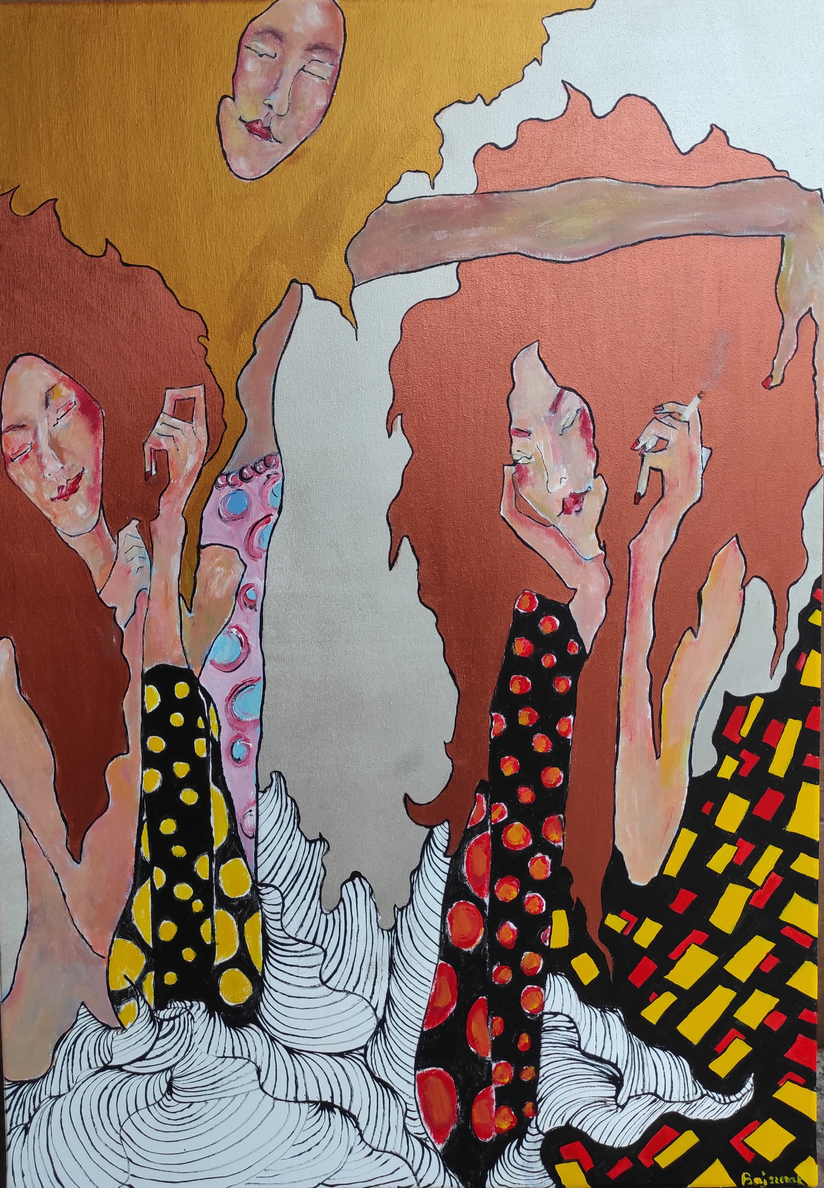 Obraz emanuje ciepłem i radością, a różnorodność kolorów sprawia, że aż trudno oderwać wzrok. Dominują odcienie brązu, złota i czerwieni, które tworzą harmonijną kompozycję przypominającą letnie popołudnie. Trzy postacie zdają się unosić w eterycznym tańcu, ich twarze zwrócone są do wewnątrz, jakby w głąb własnych myśli. Jest tak, jakby otaczał je magiczny spokój. Kropki wszędzie—jak uśmiechy, które bawią się na płaszczach modeli. Technika artystyczna jest pełna swobody, z nieco abstrakcyjnym podejściem do formy. Rysowane płynne linie i subtelne detale zdają się falować, tworząc dynamiczne wrażenie ruchu. Dzieło można interpretować jako introspekcję, uczucie zanurzenia w sobie. Dla dziecka ten obraz to "trzy panie w śmiesznych sukienkach tańczą na chmurkach". Może skłaniać do refleksji na temat harmonii ze sobą—bo przecież to takie ważne. A może to po prostu chwila ukojenia, escape from reality, której każdy z nas czasem potrzebuje.