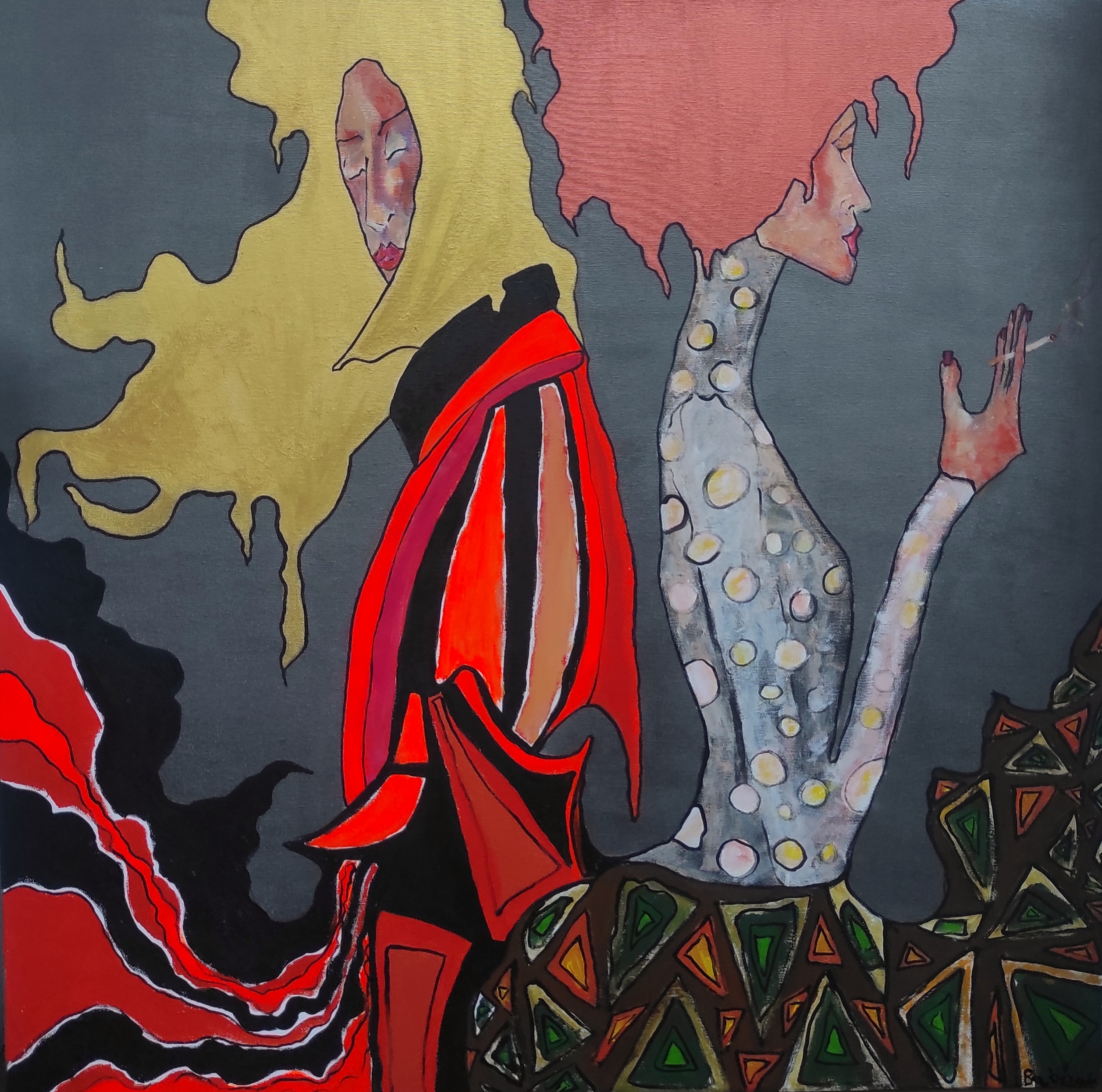Na obrazie dominują intensywne kolory: krwista czerwień, złociste tony i przygaszone szarości. Równocześnie widzimy tu unikalne formy i kształty. Przemyślana kompozycja sprawia, że wzrok wędruje z dwóch postaci, jedną w czerwieni, drugą w pastelach. Atmosfera dzieła łączy tajemnicę i subtelną niepokój. W tle kryje się coś mrocznego, ale i fascynującego. Artysta zastosował mocne kontury i dynamiczne linie, które dodają obrazowi rytmu. Zastosowana technika przypomina nieco komiksowy styl, ale z artystycznym twistem. Obraz wyzwala emocje konsternacji i zachwytu. „Te kolory są jak najsmaczniejsze cukierki” – mogłoby powiedzieć dziecko. Takie „wow!” dla zmysłów. Elementy przypominające plamy przypominają o beztrosce dziecięcych zabaw. Może być to opowieść o wewnętrznych zmaganiach lub po prostu sen zapisany na płótnie. A może to tylko moja, subiektywna interpretacja. Styl jest nieco surrealistyczny, te kropki jakby chciały powiedzieć coś więcej. Całość pozostawia odbiorcę z myślą, że jest coś więcej „beyond” tego, co widzimy na pierwszy rzut oka.