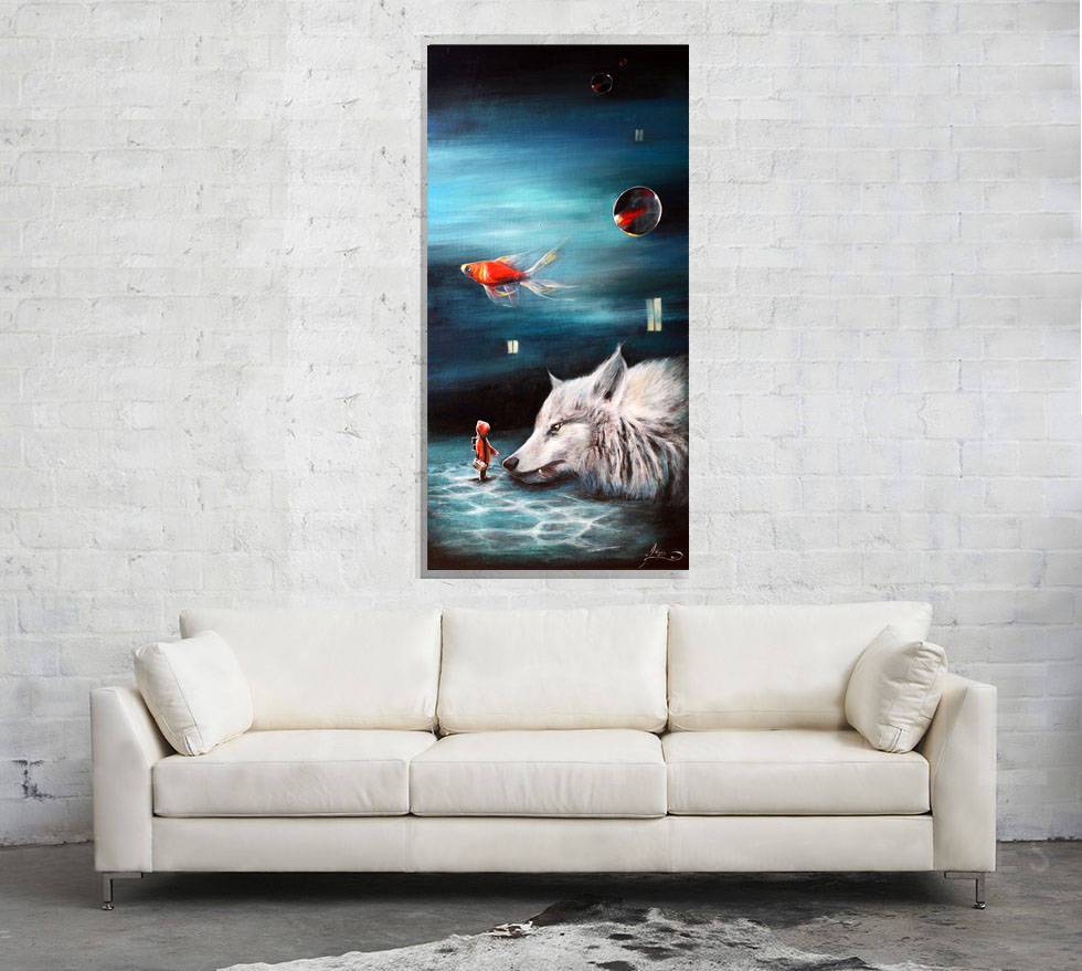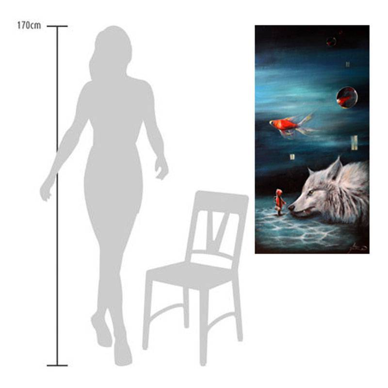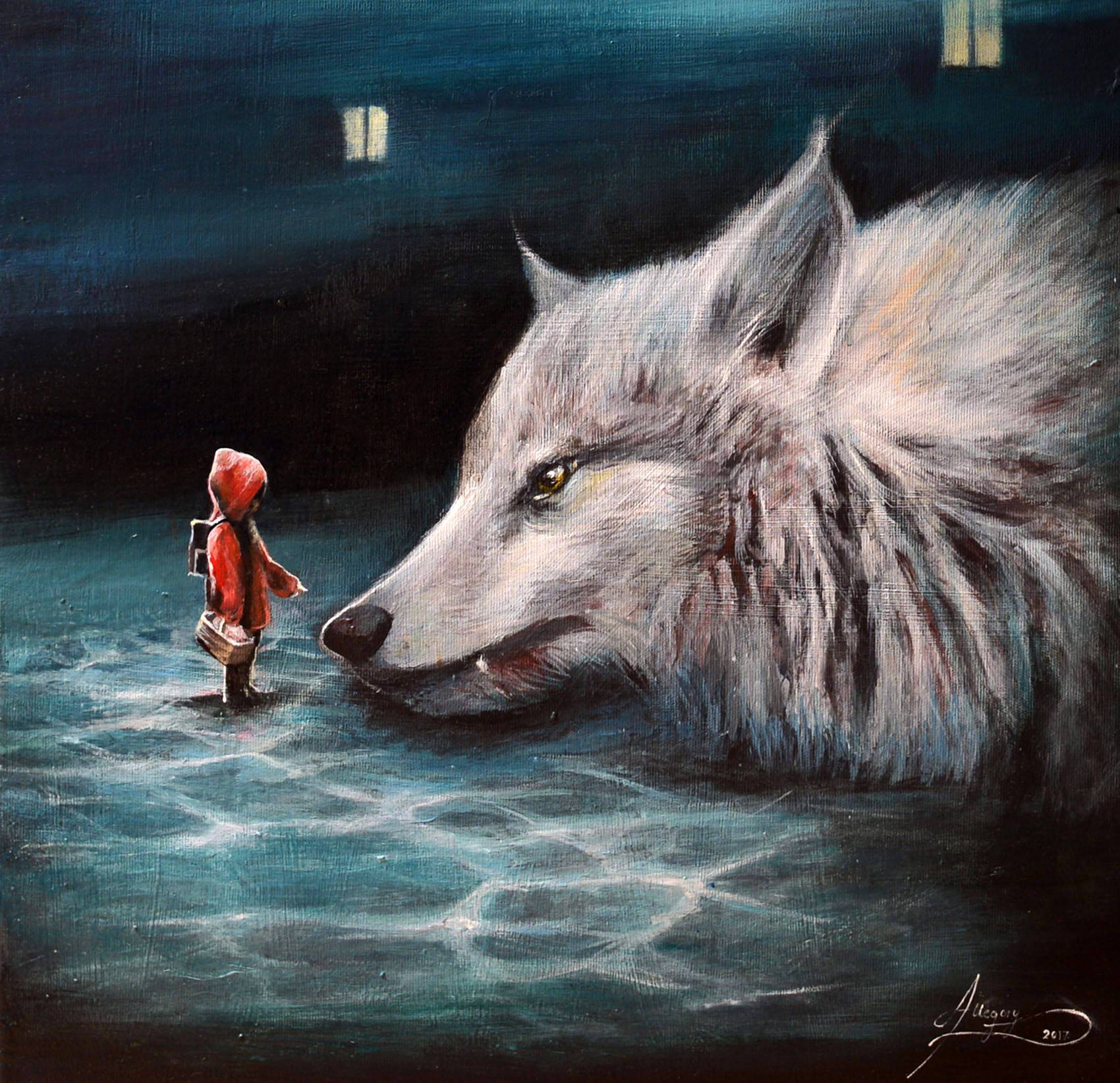 Surrealistyczny obraz na grubym płóciennym podobraziu z cyklu obrazów pt. "Czerwony kapturek historia alternatywna". Praca nie wymaga oprawy, gdyż boczne krawędzie są zamalowane i są kontynuacją obrazu- wrażenie 3D. Praca zawerniksowana matowym werniksem, gotowa do zawieszenia na ścianie. Obraz sygnowany w prawym dolnym rogu monogramem artysty /Allegory 2017. Obraz jest częścią otwartego cyklu malarskiego, rozpoczętego w 2017 roku pt."Czerwony kapturek historia alternatywna". Obraz "Przebudzenie czyli Czerwony Kapturek historia alternatywna" to nawiązanie do powszechnie znanej baśniowej postaci małej dziewczynki, noszącej czerwone nakrycie głowy, wywodzącej się z baśni ludowych, a opisanej po raz pierwszy przez Charlesa Perraulta w 1697 roku w książce " Bajki Babci Gąski". Postać czerwonego Kapturka najczęściej jest kojarzona z Bajką Braci Grimm z XIX wieku pt."Czerwony Kapturek". W każdej z tych historii Wilk jest wrogiem Czerwonego Kapturka, który chce go oszukać i zjeść. Celem autora było stworzenie historii współczesnej, alternatywnej,gdzie Czerwony Kapturek i Wilk są przyjaciółmi, współtowarzyszami podróży. Obraz ukazuje przemianę wewnętrzną bohaterów, gdzie Kapturek jest już dojrzalszą, mniej naiwną dziewczynką, a Wilk jest nastawiony na pozytywne działanie, nie zaś podstęp. Obraz "Przebudzenie czyli Czerwony Kapturek historia alternatywna" obrazuje Przebudzenie w każdym tego słowa znaczeniu, oświecenie duchowe, duchowe przebudzenie, zrozumienie, pojednanie, akceptację, nowe spojrzenie.