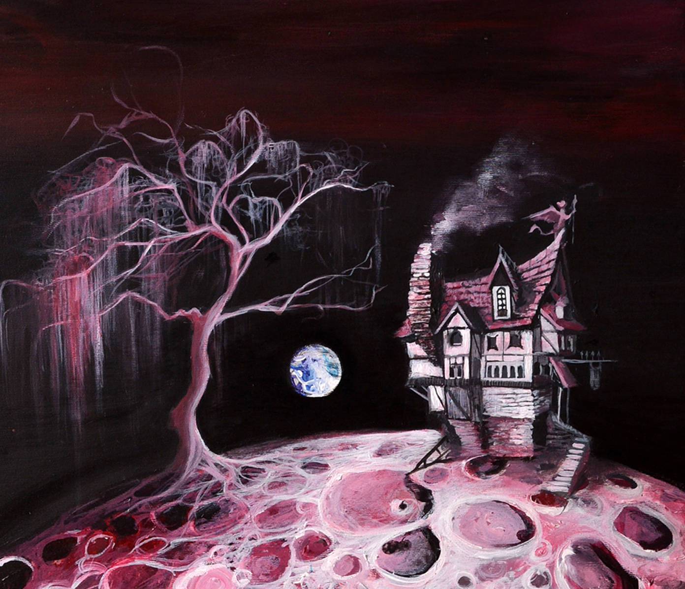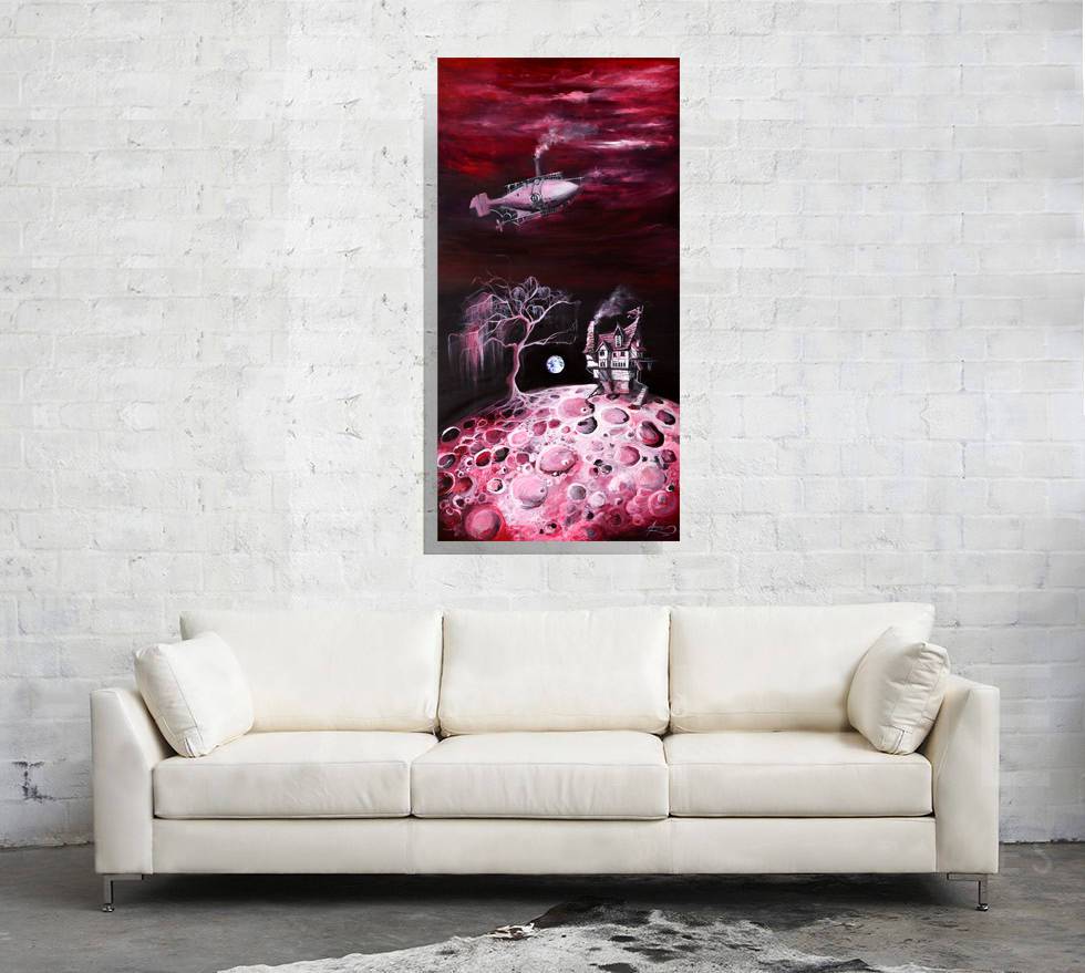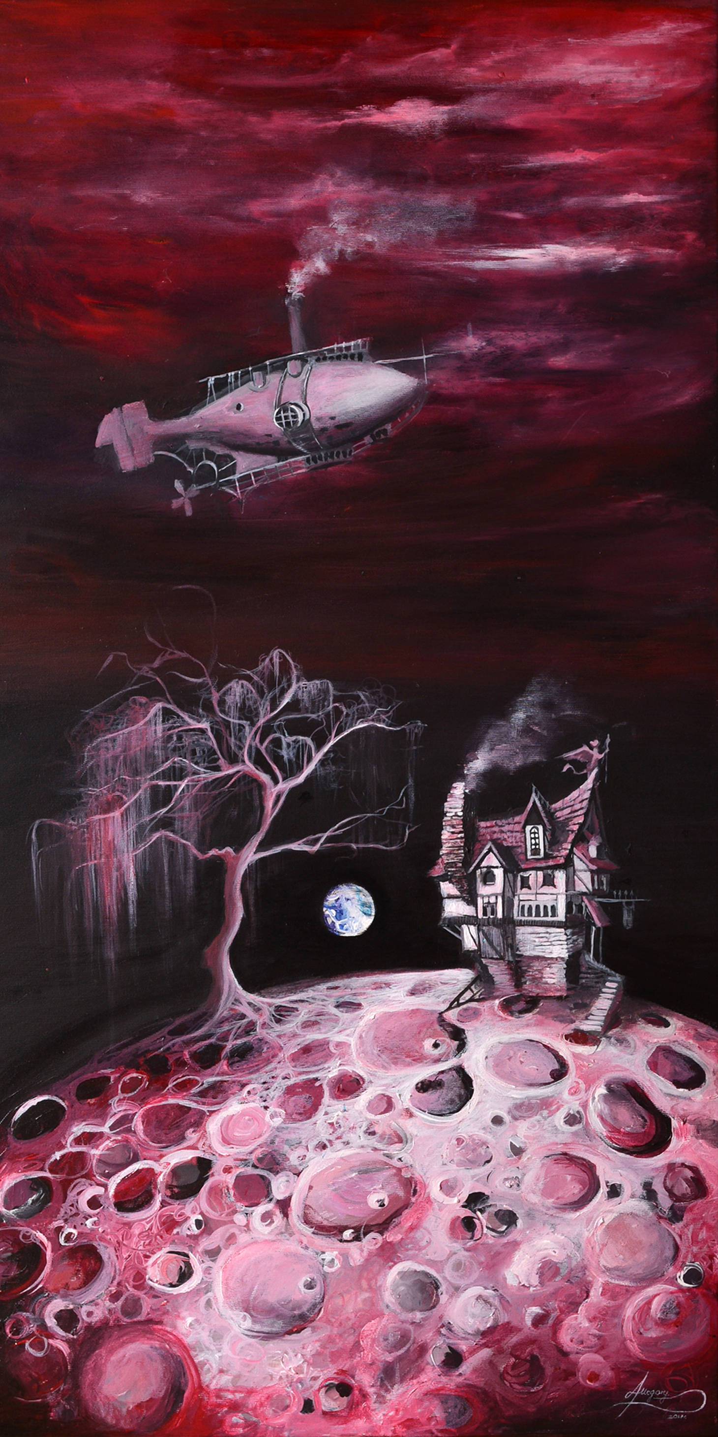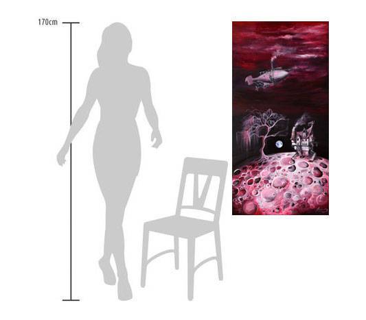 Surrealistyczny obraz na grubym płóciennym podobraziu z cyklu obrazów pt. "Trzy planety"(tryptyk). Praca nie wymaga oprawy, gdyż boczne krawędzie są zamalowane i są kontynuacją obrazu- wrażenie 3D. Praca zawerniksowana błyszczącym werniksem, gotowa do zawieszenia na ścianie. Obraz sygnowany w prawym dolnym rogu monogramem artysty /Allegory 2017. Obraz jest częścią tryptyku pt."Trzy planety". Cykl przedstawia surrealistyczne planety z nutą steampunku, każda planeta posiada indywidualne dla siebie miejsce do mieszkania, roślinność, latający pojazd a także kolorystykę. Odbiorca może sobie wybrać idealne dla siebie miejsce z dala od ziemskiego zgiełku-miejsce spośród trzech planet, gdyż każda oferuje inną atmosferę (w każdym tego słowa znaczeniu). Obraz "Wczasy" to dobitne ukazanie wczasów, odpoczynku z dala od cywilizacji z widokiem na planetę Ziemia. Jest to metafora dystansu, beztroski, odpowiedniego pełnego radości podejścia do ziemskich spraw. Obrazy kupione razem jako tryptyk = niższa cena za całość
