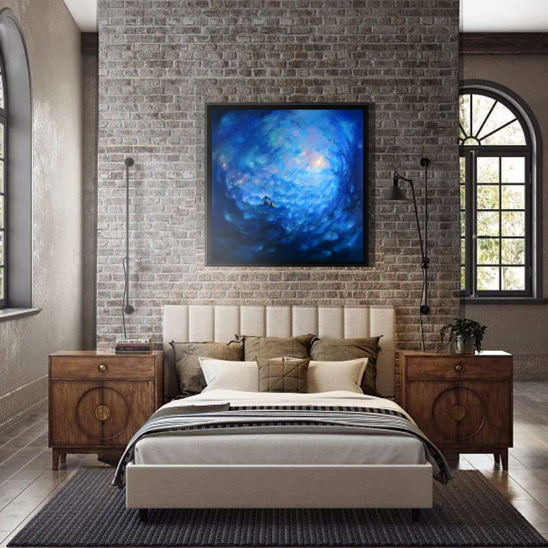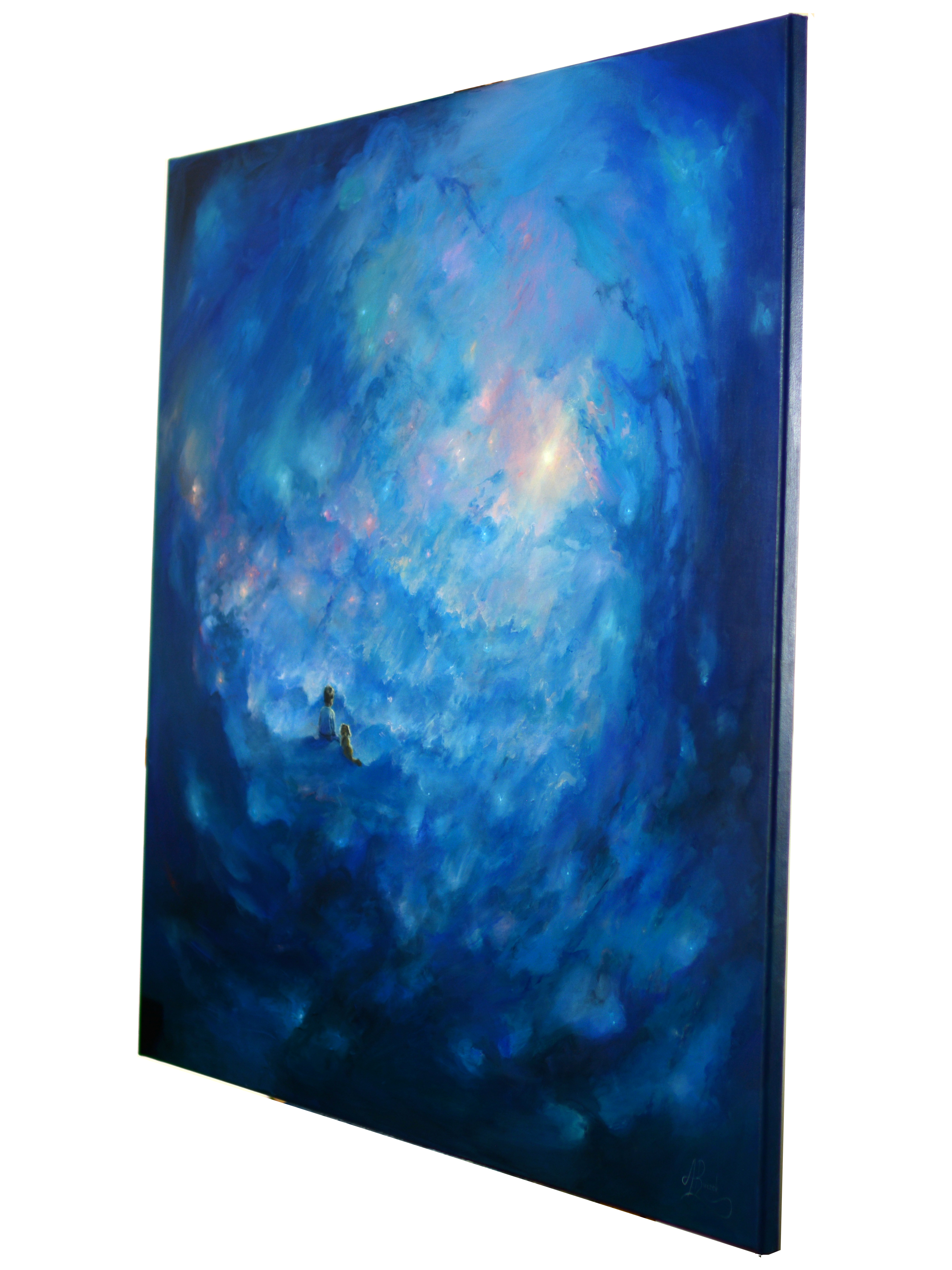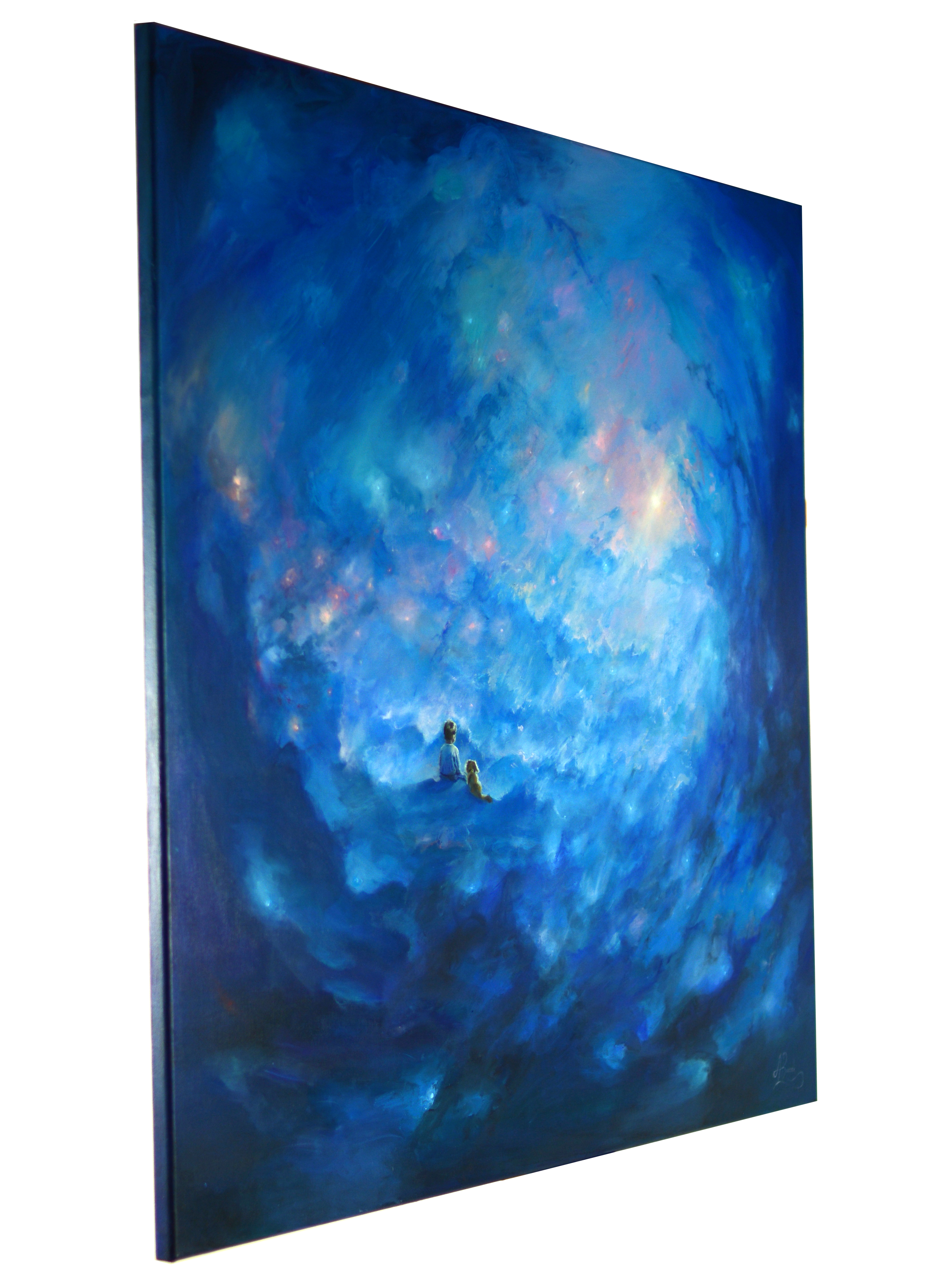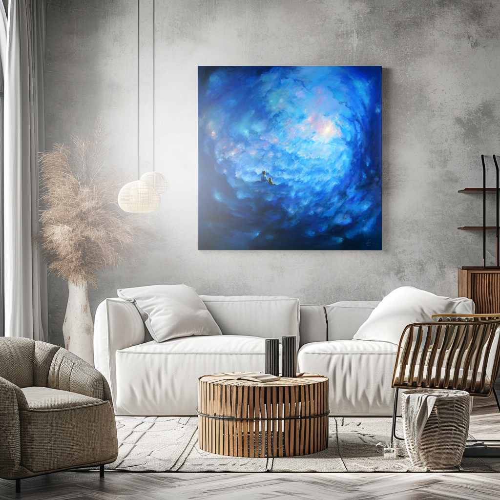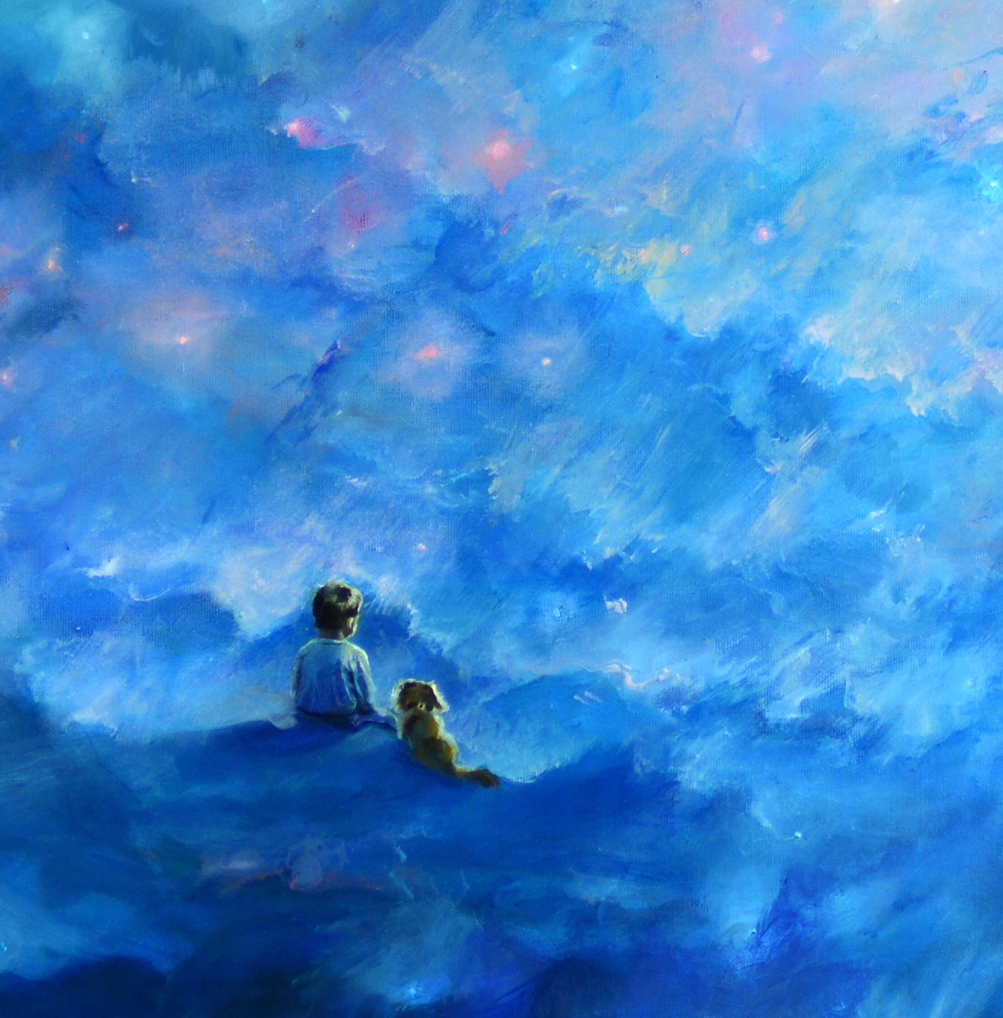 Na obrazie dominuje głęboki niebieski kolor, który przechodzi od ciemnych odcieni na dole do jaśniejszych, niemal świetlistych u góry. Wygląda, jakby chłopiec i jego pies siedzieli w oceanie chmur, a nad nimi rozciągało się niebo pełne magicznych odcieni błękitu. Kompozycja obrazu jest uroczo dynamiczna, z wirującymi chmurami, które nadają całości odrobinę tajemniczego klimatu. Tło sprawia wrażenie niekończącej się przestrzeni, które hipnotyzuje i zachęca do zanurzenia się w tym niesamowitym oceanie marzeń. Nastrój obrazu jest spokojny i refleksyjny, wręcz medytacyjny. Można niemal poczuć senność i błogość, jaką daje obserwacja tego spektaklu kolorów. Styl artystyczny przypomina impresjonizm, z miękkimi pociągnięciami pędzla, które tworzą efekt rozmycia i eteryczności. Wygląda na to, że artysta chciał uchwycić chwilę zatrzymania się w czasie. Obraz może wywoływać różne emocje. Od spokojnej kontemplacji, przez poczucie nostalgii, aż po radosną ekscytację odkrywania czegoś nieznanego. Aż chce się usiąść koło tego chłopca i po prostu gapić się w nieskończoność. Niebieskie odcienie wprowadzają poczucie spokoju, ale też tajemnicy. Trochę wygląda jak marzenie, które nagle staje się rzeczywistością.