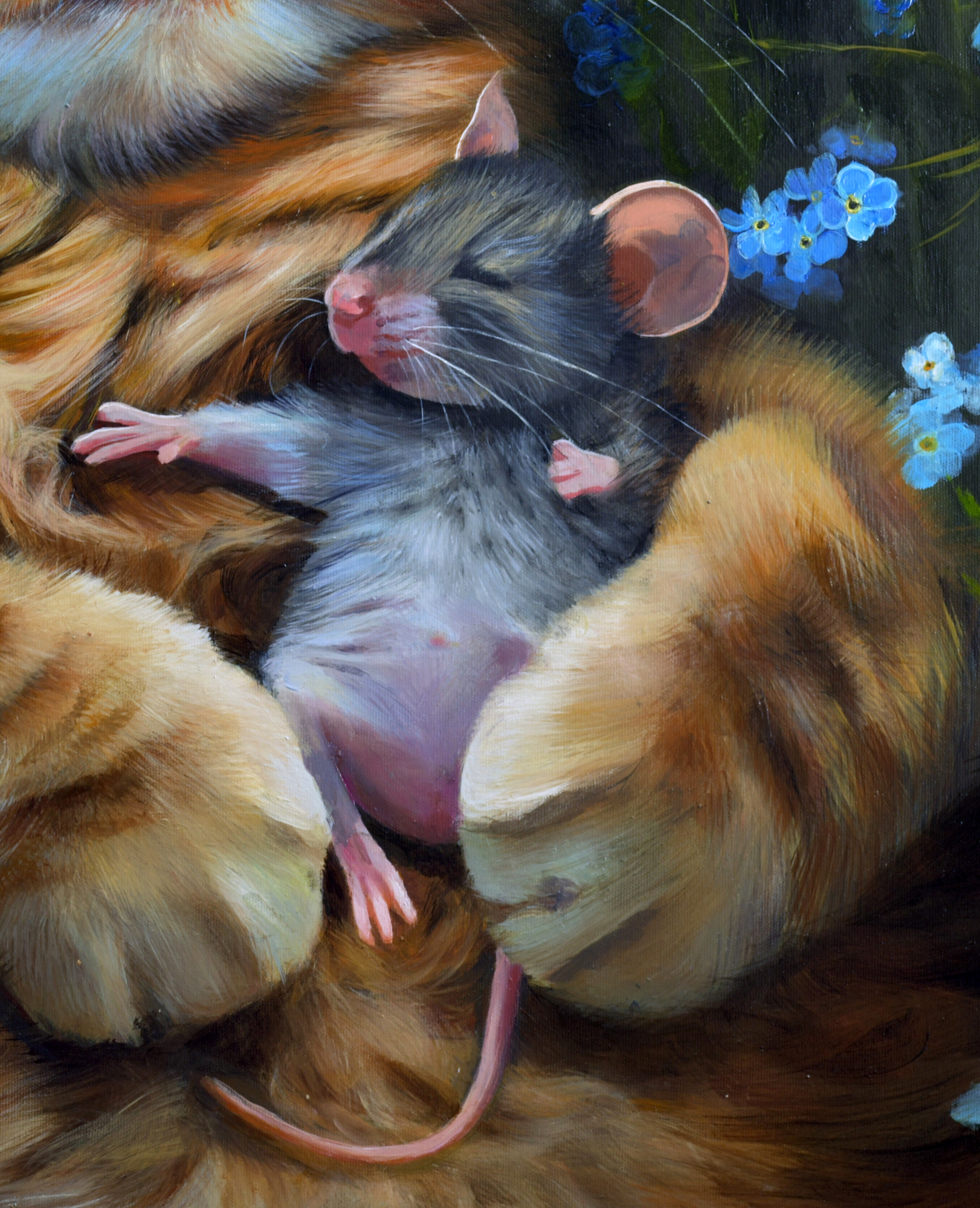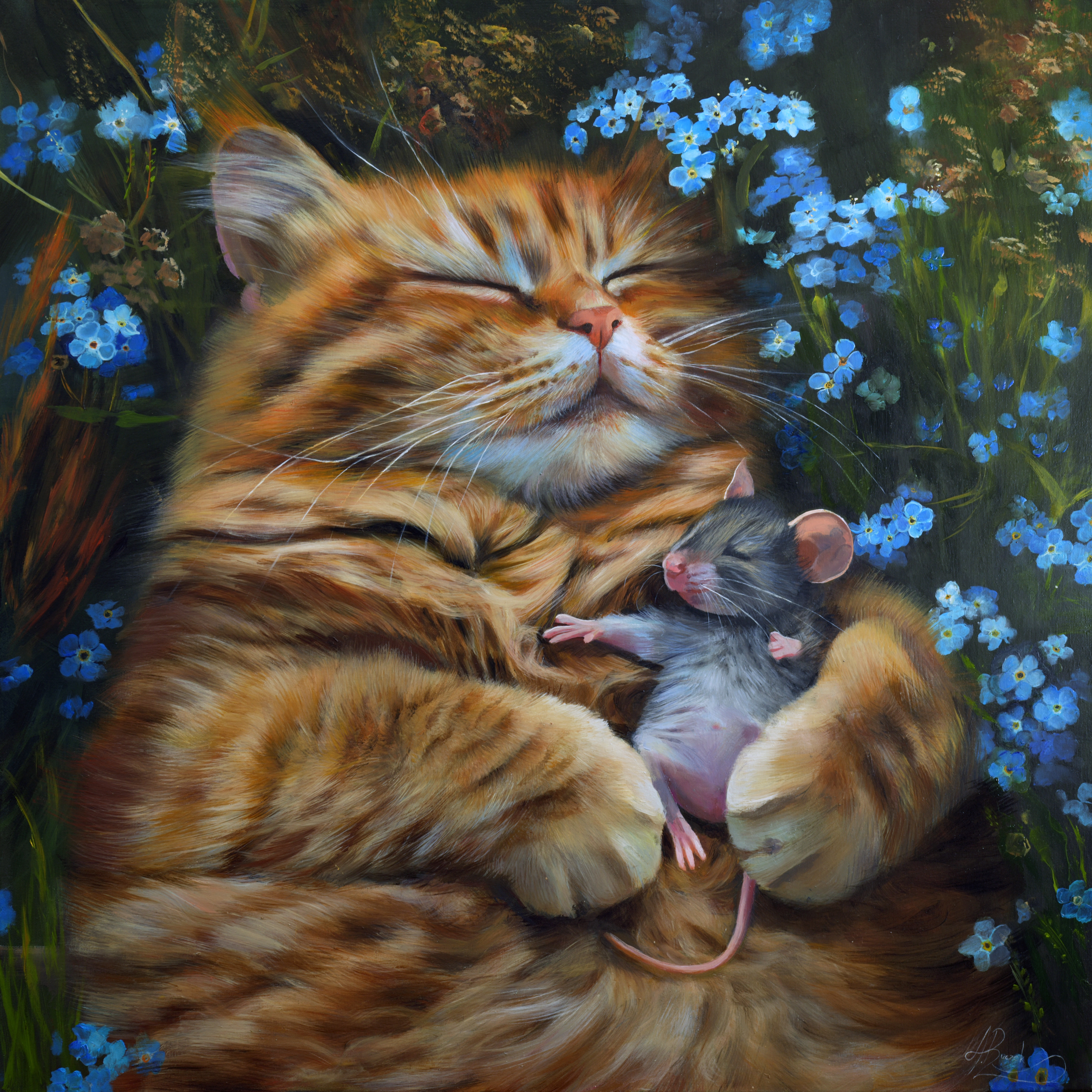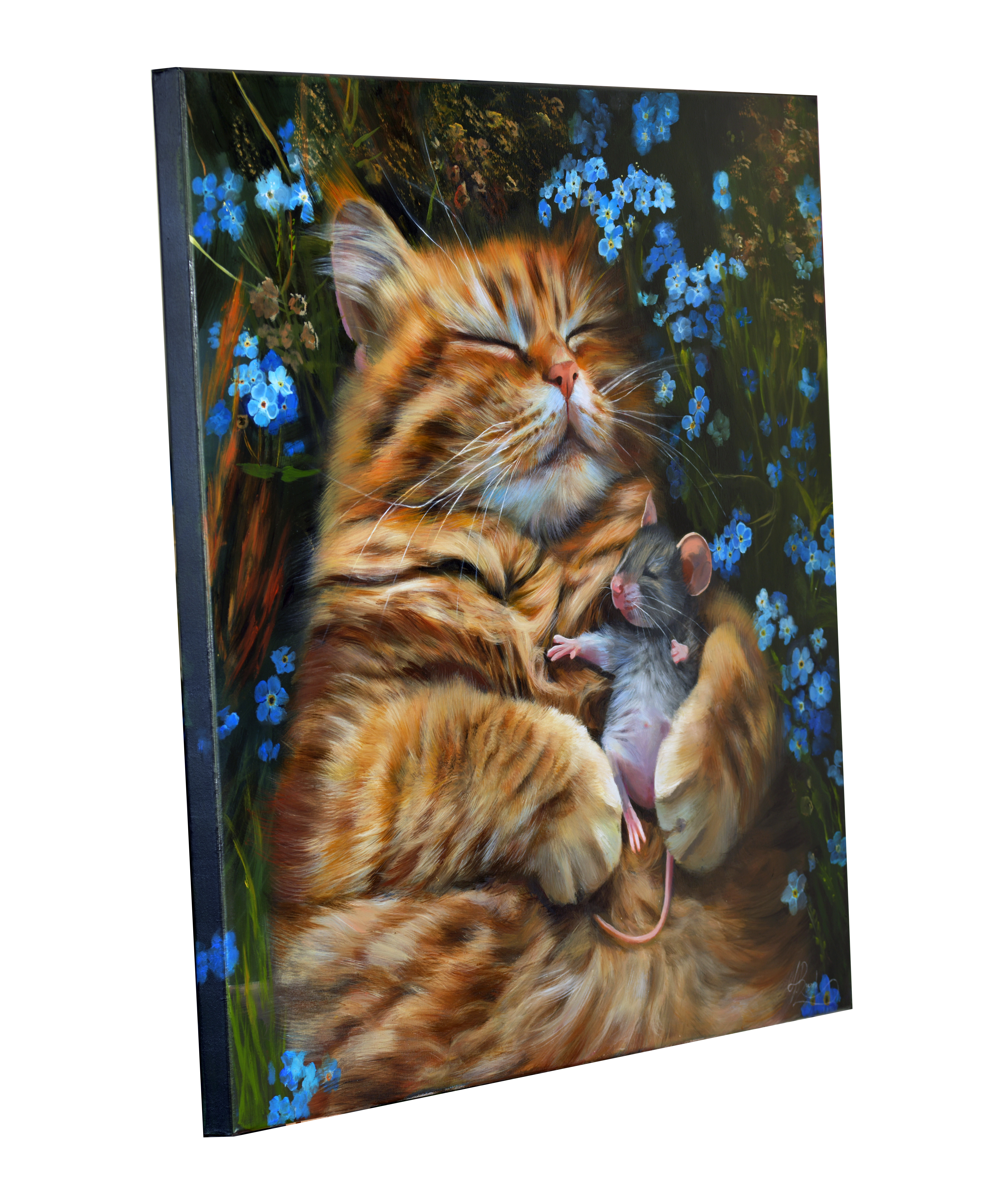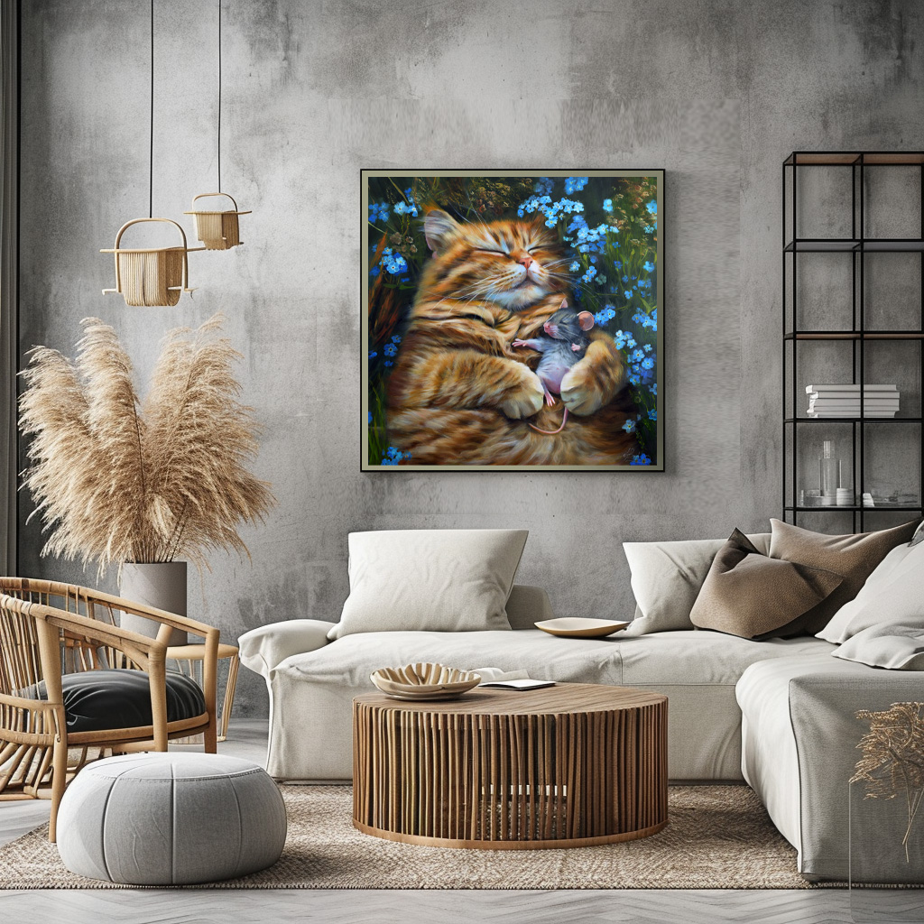 Obraz "Ponad podziałami" przedstawia pozornie niemożliwą scenę: kot śpiący w objęciach z myszą, jego naturalną ofiarą. To więcej niż uroczy motyw – to silna, wizualna metafora pokoju jako aktu odwagi, czułości i wyboru ponad instynktem. W świecie, który zbyt często dzieli, klasyfikuje i przeciwstawia, ten obraz mówi o alternatywie: o chwili, w której odwieczne napięcia i wrogości zostają zawieszone na rzecz bliskości, współistnienia i wzajemnego szacunku. Mysz i kot, choć różni w każdym możliwym aspekcie, dzielą tu wspólną przestrzeń – nie z konieczności, lecz z wyboru. Delikatne niezapominajki, porastające łąkę wokół, są symbolem pamięci – przypomnienia o tym, co było – ale też nadziei, że to, co niemożliwe, może stać się możliwe. W tym sensie obraz staje się alegorią świata, w którym pokój nie polega na braku konfliktu, ale na obecności wzajemnego zrozumienia, nawet między tymi, którzy przez wieki byli po przeciwnych stronach. "Ponad podziałami" nie tylko ilustruje utopię – stawia pytanie: „A gdybyśmy wszyscy, jak te dwa stworzenia, choć na chwilę zawiesili uprzedzenia, instynkty i lęki – co mogłoby się wtedy wydarzyć?” To cichy manifest pokoju – nie poprzez siłę, ale przez bliskość i empatię. Obraz powstał na płóciennym podobraziu naciągniętym na blejtramę z wykorzystaniem farb olejnych. Obraz posiada zamalowane boki i jest gotowy do zawieszenia na ścianie w ramie, lub bez niej. Użycie najwyższej jakości materiałów oraz późniejsze zawerniksowanie gotowego dzieła, daje mu niezwykłą trwałość na długie lata.