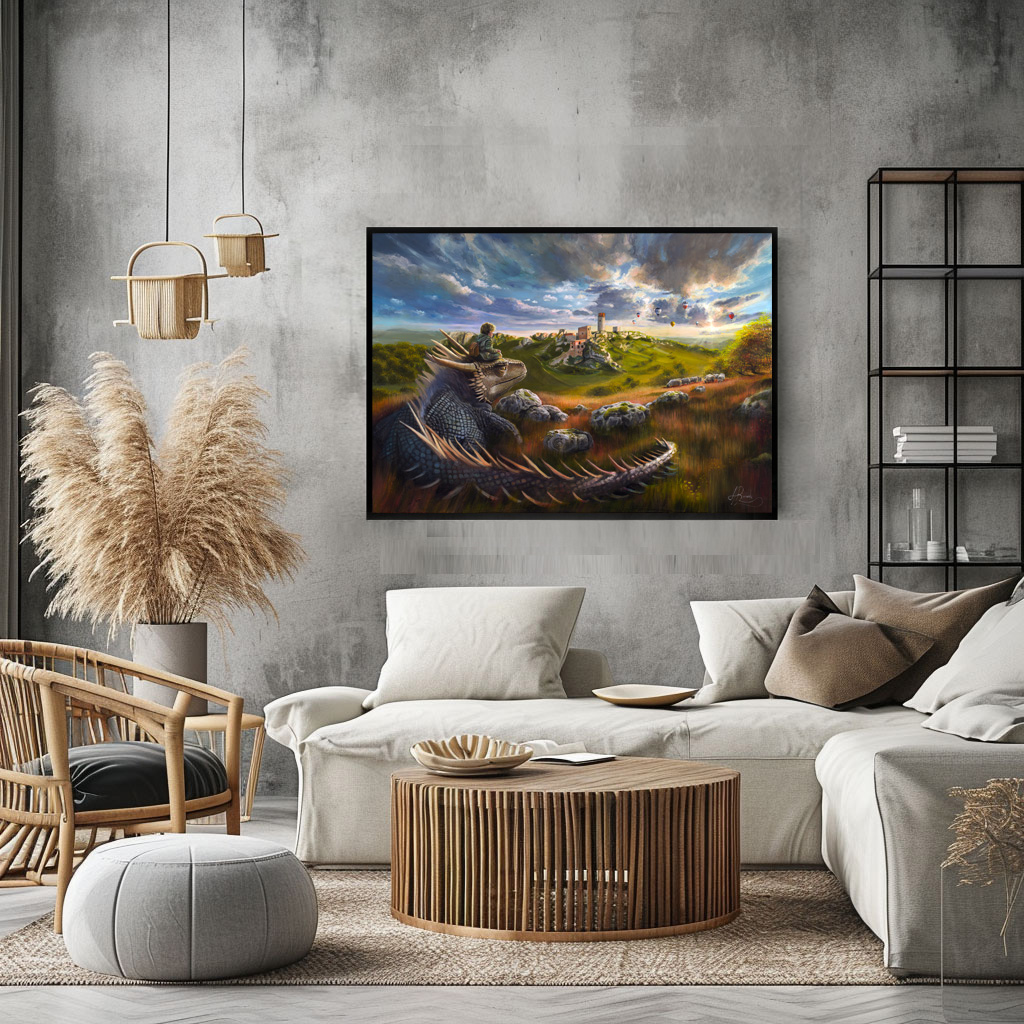 Magiczne miejsce to surrealistyczny obraz wykonany w 2025 roku. "Magiczne miejsce" to malarska opowieść o dziecięcej wyobraźni, marzeniach i potrzebie odkrywania świata na nowo. Na pierwszym planie widzimy chłopca siedzącego na głowie smoka, w niemal medytacyjnej pozycji — spokojnego, wyciszonego, jakby w pełni zanurzonego w chwili. Jego spojrzenie kieruje się ku odległemu zamkowi, skąpanemu w złocistym świetle zachodzącego słońca. Ten niezwykły duet – dziecko i smok – symbolizuje odwagę, wewnętrzny spokój oraz zaufanie do życia. W pejzażu pełnym miękkiego światła i bogactwa detali rzeczywistość przenika się z fantazją. Ciepłe promienie słońca tańczą po trawie i skałach, tworząc atmosferę spokoju, nadziei i harmonii, podczas gdy na niebie unoszą się kolorowe balony – znak wolności, marzeń i lekkości bytu. Malarsko obraz utrzymany jest w duchu realizmu magicznego – łączy realistyczne ujęcie pejzażu z elementami fantastycznymi, tworząc wizję pełną tajemnicy i symbolicznego znaczenia. Światło rozproszone po niebie i refleksy na smoczej łusce przywodzą na myśl impresjonistyczną grę barw, podczas gdy dbałość o detal podkreśla żywą materię natury i wyobraźni. "Magiczne miejsce" to nie tylko pejzaż – to stan ducha. To przestrzeń kontemplacji i zachwytu, w której chłopiec i smok stają się jednym z naturą i światem marzeń. To przypomnienie, że magia istnieje nie gdzieś daleko, lecz tuż obok – w ciszy, w oddechu, w uważności i w dziecięcej zdolności do zachwytu nad chwilą. Każdy obraz powstaje tylko raz, jest jedyny i niepowtarzalny. Oryginalne dzieła poza walorami estetycznymi i głębokim przekazem, posiadają wysoką wartość kolekcjonerską."Magiczne miejsce" to malarska opowieść o dziecięcej wyobraźni, marzeniach i potrzebie odkrywania świata na nowo. Na pierwszym planie widzimy chłopca siedzącego na głowie smoka, w niemal medytacyjnej pozycji — spokojnego, wyciszonego, jakby w pełni zanurzonego w chwili. Jego spojrzenie kieruje się ku odległemu zamkowi, skąpanemu w złocistym świetle zachodzącego słońca. Ten niezwykły duet – dziecko i smok – symbolizuje odwagę, wewnętrzny spokój oraz zaufanie do życia. W pejzażu pełnym miękkiego światła i bogactwa detali rzeczywistość przenika się z fantazją. Ciepłe promienie słońca tańczą po trawie i skałach, tworząc atmosferę spokoju, nadziei i harmonii, podczas gdy na niebie unoszą się kolorowe balony – znak wolności, marzeń i lekkości bytu. Malarsko obraz utrzymany jest w duchu realizmu magicznego – łączy realistyczne ujęcie pejzażu z elementami fantastycznymi, tworząc wizję pełną tajemnicy i symbolicznego znaczenia. Światło rozproszone po niebie i refleksy na smoczej łusce przywodzą na myśl impresjonistyczną grę barw, podczas gdy dbałość o detal podkreśla żywą materię natury i wyobraźni. "Magiczne miejsce" to nie tylko pejzaż – to stan ducha. To przestrzeń kontemplacji i zachwytu, w której chłopiec i smok stają się jednym z naturą i światem marzeń. To przypomnienie, że magia istnieje nie gdzieś daleko, lecz tuż obok – w ciszy, w oddechu, w uważności i w dziecięcej zdolności do zachwytu nad chwilą. Każdy obraz Agaty Buczek powstaje tylko raz, jest jedyny i niepowtarzalny. Oryginalne dzieła poza walorami estetycznymi i głębokim przekazem, posiadają wysoką wartość kolekcjonerską.