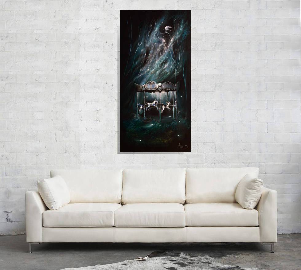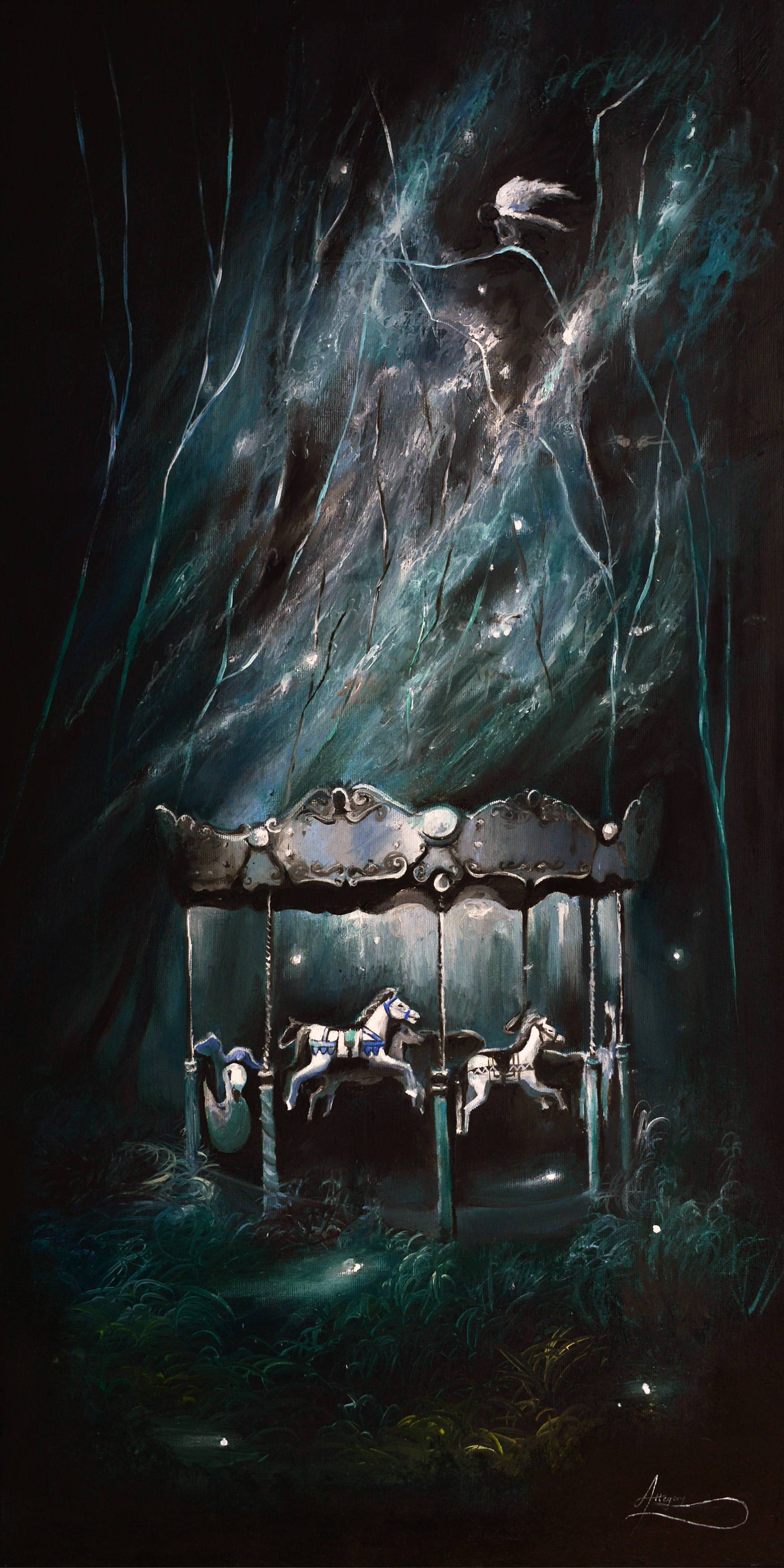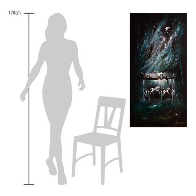 Olejny obraz na grubym płóciennym podobraziu z cyklu obrazów pt. "Cisza". Praca nie wymaga oprawy, gdyż boczne krawędzie są zamalowane i są kontynuacją obrazu- wrażenie 3D. Praca zawerniksowana błyszczącym werniksem (efekt lekko błyszczący- satynowy), gotowa do zawieszenia na ścianie. Obraz sygnowany w prawym dolnym rogu monogramem artysty /Allegory. Obraz o magicznym klimacie jest metaforą muzyki. Zamysłem autora było sprawić, aby odbiorca patrząc na obraz, słyszał muzykę, lecącą z pozytywki, nad którą czuwa anioł stróż.
