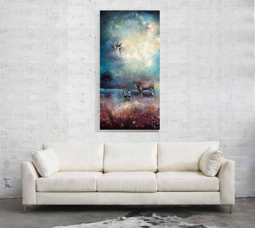 Surrealistyczny obraz na grubym płóciennym podobraziu z cyklu obrazów pt. "Cisza". Praca nie wymaga oprawy, gdyż boczne krawędzie są zamalowane i są kontynuacją obrazu- wrażenie 3D. Praca zawerniksowana błyszczącym werniksem, gotowa do zawieszenia na ścianie. Obraz sygnowany w prawym dolnym rogu monogramem artysty /Agata 11.11.2016. Obraz jest częścią otwartego cyklu malarskiego, rozpoczętego w 2016 roku pt."Cisza". Cykl przedstawia niewielkie postaci dzieci najczęściej ukazane z tyłu, będące alegorią emocji. Obraz ukazuje magię życia, miłość, radość, beztroskę. Bo czasem życie jest jak bajka. Obraz miał brać udział w wystawie w Galerii Delfiny w Warszawie w marcu 2017 roku, jednak został natychmiast sprzedany.
