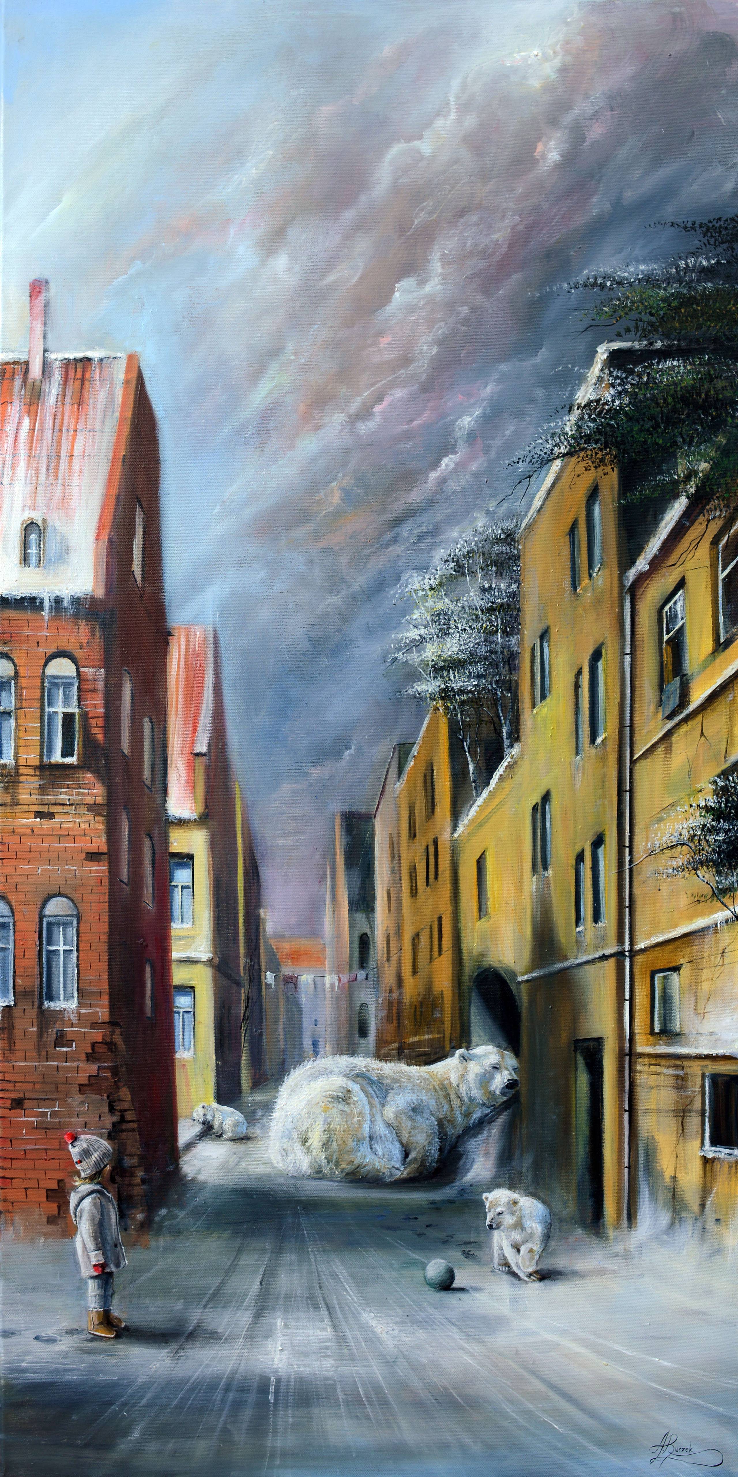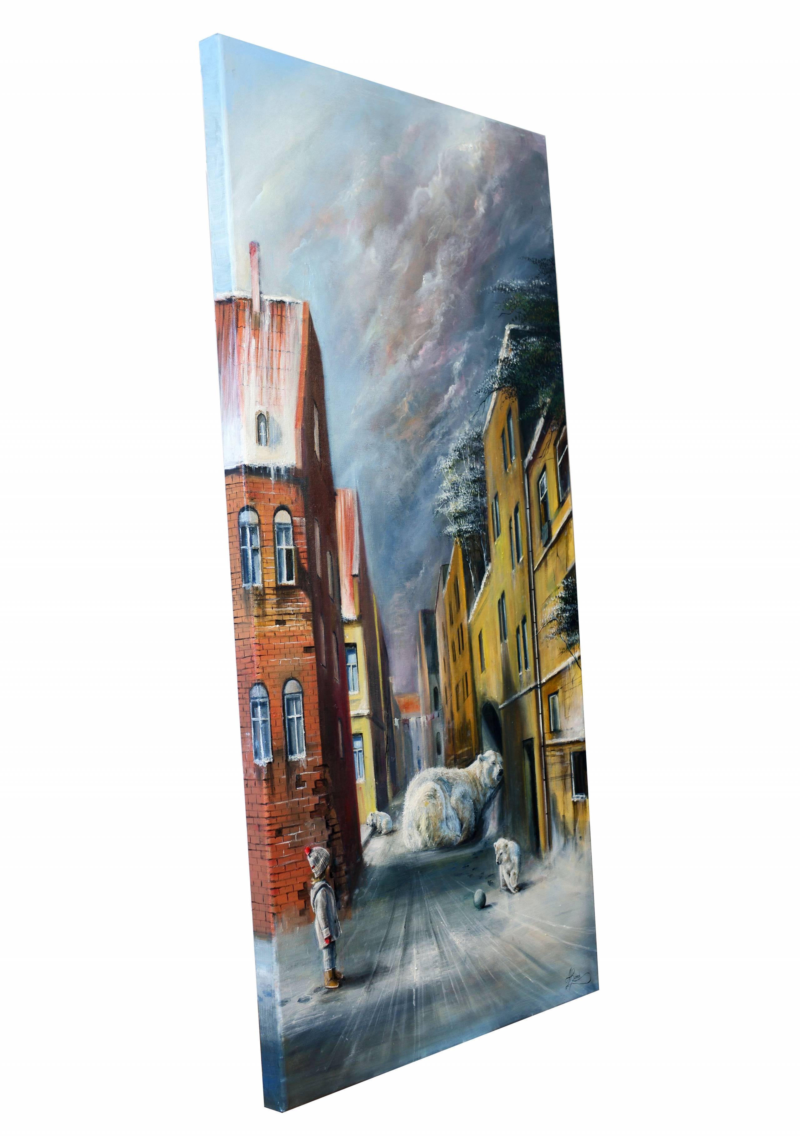 "Dziewczynka w czerwonych rękawiczkach" to surrealistyczny obraz na grubym płóciennym podobraziu z cyklu obrazów pt. "Miasto niedźwiedzi". Najwyższej jakości farby olejne, wysokiej jakości płócienne podobrazie 3D(grubość ok. 3,5cm, grubsze niż przeciętne, przez co obraz wydaje się masywniejszy), bardzo duża szczegółowość i różnorodność barw. Praca nie wymaga oprawy, gdyż boczne krawędzie są zamalowane i są kontynuacją obrazu- wrażenie 3D. Praca zawerniksowana satynowym werniksem, gotowa do zawieszenia na ścianie. Obraz sygnowany w prawym dolnym rogu monogramem artysty /A.Buczek. „Dziewczynka w czerwonych rękawiczkach” to opowieść o przebudzeniu, o wyjściu ze smutku, o odnajdywaniu radości w małych rzeczach w życiu codziennym. To metaforyczna opowieść o dziewczynie, która samotnie odwiedza miasto pełne wielkich niedźwiedzi polarnych, by pobawić się ze swoim ulubieńcem- małym misiem. To wzruszająca opowieść o wyjściu z lęku, z depresji. Mały miś symbolizuje radość i ciekawość świata, zaufanie, natomiast duży śpiący niedźwiedź to niepokój, problemy. Śnieg symbolizuje spokój a otwarte okna świeżość, nowe szanse, możliwości. Obraz posiada bardzo miłą dla oka kolorystykę, świetnie sprawdzi się w sypialni,bądź w pokoju dziennym, a jego podłużna forma i spora wielkość, sprawiają , iż może być ciekawą dominantą na ścianie.