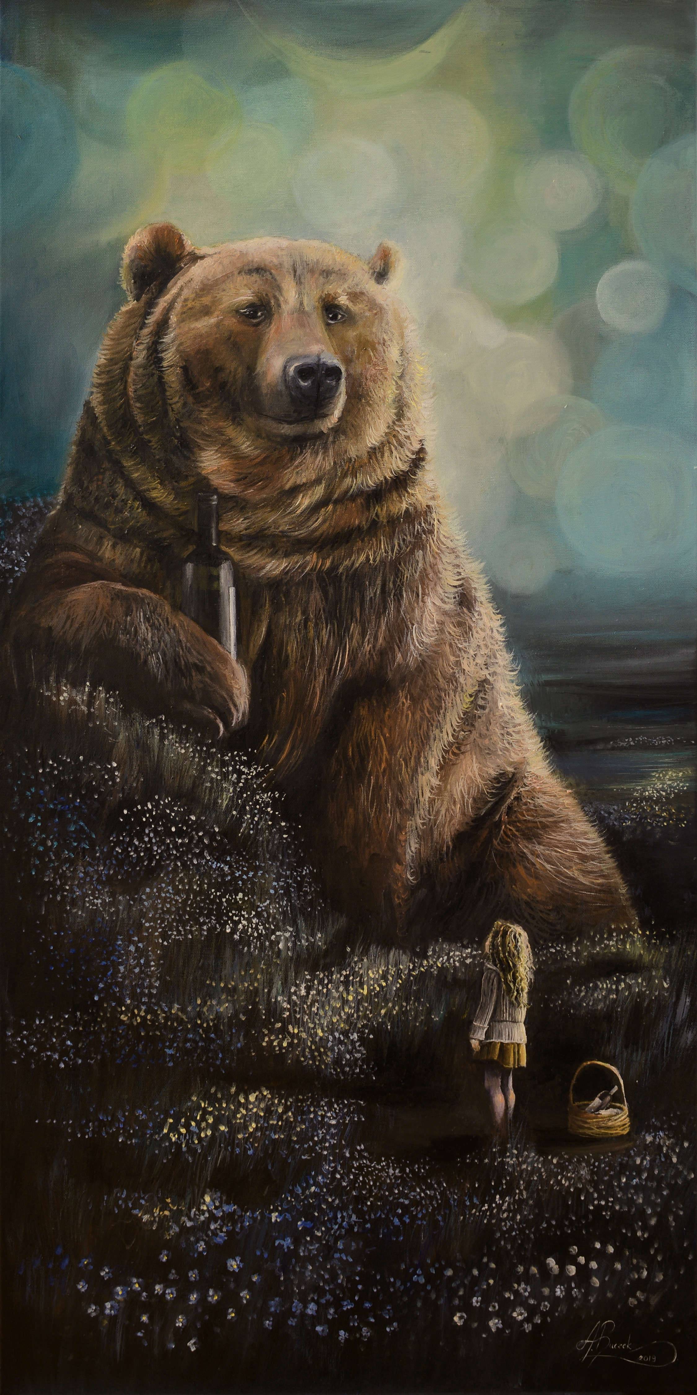 Surrealistyczny obraz na grubym płóciennym podobraziu z cyklu obrazów pt. Cisza. Najwyższej jakości farby olejne, wysokiej jakości płócienne podobrazie 3D (grubość ok. 3,5cm, grubsze niż przeciętne, przez co obraz wydaje się masywniejszy), bardzo duża szczegółowość i różnorodność barw. Praca nie wymaga oprawy, gdyż boczne krawędzie są zamalowane i są kontynuacją obrazu- wrażenie 3D. Praca zawerniksowana satynowym werniksem, gotowa do zawieszenia na ścianie. Obraz sygnowany w prawym dolnym rogu monogramem artysty /A.Buczek 2019. Młode wino to bardzo pozytywny obraz, pełen humoru, światła, kwiatów, zachęcający do afirmacji życia, obraz przedstawia głęboką rozmowę przy winie między młodą dziewczyną a jej przyjacielem niedźwiedziem, gdzie głównym tematem rozmowy zdaje się być odbiorca obrazu- patrzący na obraz.