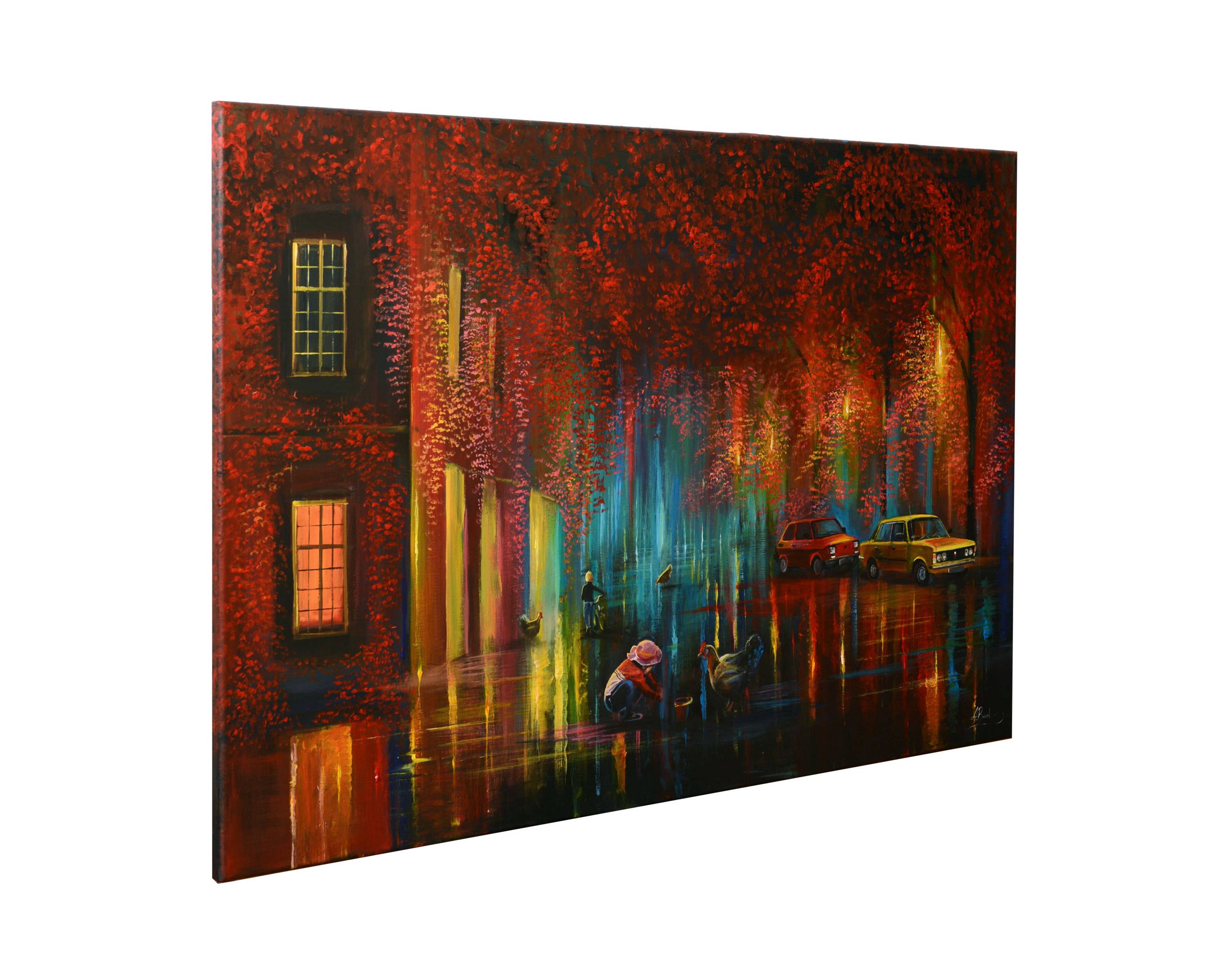 „Sentyment" Nowoczesny impresjonistyczny obraz z cyklu pt. ”Kolorowy deszcz”. To kolejna praca z tego cyklu w klimacie PRLu. Cykl charakteryzuje się wyrazistością kolorów, impresjonistycznym stylem, motywem światła a przede wszystkim bardzo grubo kładzioną farbą i jaskrawymi kolorami. Kolorowy deszcz to metafora odnosząca się do grudek farby- kolorowych kropli na obrazie. Praca nie wymaga oprawy, gdyż boczne krawędzie są zamalowane i są kontynuacją obrazu- impresjonistyczne plamy również po bokach obrazu. Praca zakonserwowana błyszczącym werniksem (efekt lekkiego błyszczenia -satynowy), gotowa do zawieszenia na ścianie. Obraz sygnowany w prawym dolnym rogu monogramem artysty /A.Buczek. Obraz nawiązuje do czasów PRLu, do dzieciństwa lat 70tych, 80tych, które wielu z nas pamięta, kiedy to dzieci bawiły się na podwórku. Obraz „Sentyment” to sentymentalne zdjęcie, ukłon w kierunku tamtych dni, wspomnień z dzieciństwa. Na obrazie zostały również ukazany charakterystyczne dla tamtych czasów samochody: Fiat 126p i Fiat 125p. Obraz idealnie pasuje do tradycyjnych jak i nowoczesnych wnętrz, może nadać charakteru, urozmaicić wnętrze, zachęcić do refleksji. Obraz dzięki grze światła wykonanej farbami, w półmroku, sprawia wrażenie jakby się świecił. Dzięki grudkom farby, obraz widziany w perspektywie wygląda jeszcze ciekawiej.