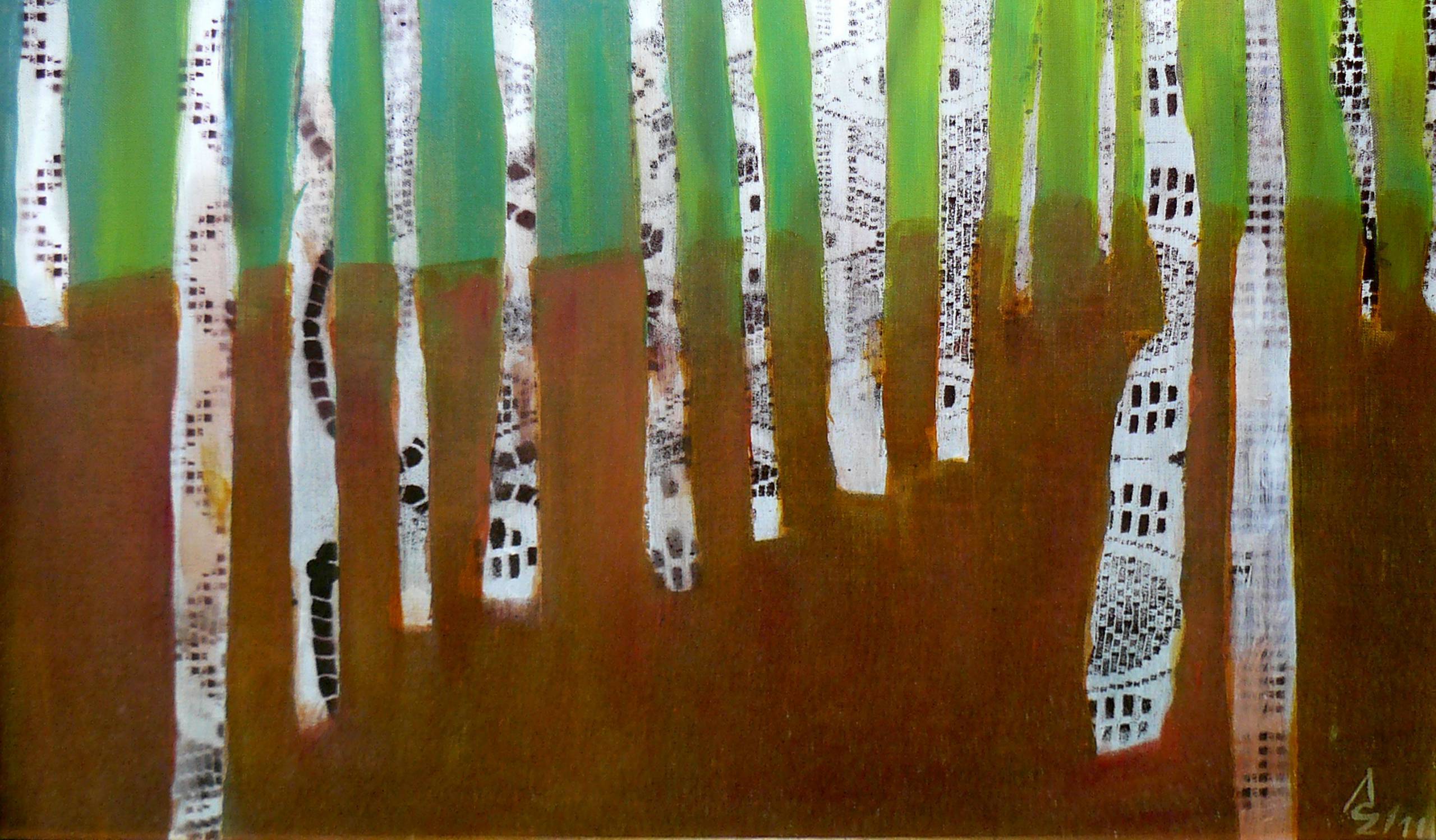 Na obrazie widzimy malowniczy las brzozowy, który wydaje się skąpany w tajemniczym świetle. Dominują tu ziemiste brązy i świeża zieleń, które idealnie kontrastują z białymi pniami brzóz, pełnymi czarnych plamek. Drzewa wydają się tańczyć na tle zielonego nieba, co dodaje kompozycji dynamiki i życia. Atmosfera obrazu jest spokojna, a jednocześnie pełna głębokiej refleksji, niemal jakbyśmy słyszeli szept liści na wietrze. Technika użyta przez artystę jest niezwykle oryginalna: prostota formy i wyrazisty koloryt dają poczucie świeżości. Poważnie, można się w tym zatracić. Styl dzieła przypomina nieco surrealizm, gdzie rzeczywistość miesza się z marzeniem. Patrząc na ten obraz, można odczuć wewnętrzny spokój, ale też fascynację tajemniczością przyrody. Dla dziecka to magiczny las, jak z bajki. "To takie drzewka, które rozmawiają ze sobą!" Podziwiam tę sztukę, bo jest taka dreamy. Wzbudza ciekawość i zachwyt i pozwala uciec od codzienności. Wywołuje na twarzy uśmiech, jakby to był inny, lepszy świat.