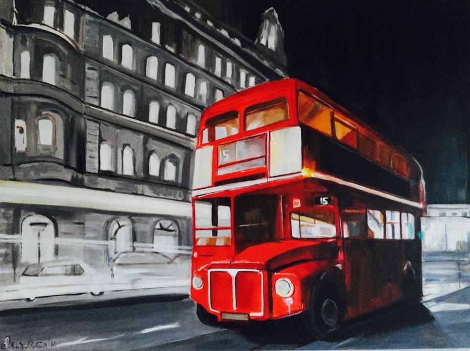 Na obrazie dominuje kontrast między głęboką czernią tła, a jaskrawą czerwienią piętrowego autobusu. To klasyczny londyński pojazd, który wydaje się prawie wyłaniać z cienia, jakby chciał opowiedzieć nam swoją historię. Budynki w tle majaczą w odcieniach szarości, podkreślając nostalgiczny charakter sceny. Technika artysty sprawia, że cała scena ożywa przy pomocy efektu rozmycia, a dynamika jest niemalże namacalna. Wow, taki obrazek! Kompozycja jest dobrze wyważona, autobus jest w centrum, jak gwiazda w przedstawieniu. Zaraz obok pojawia się atmosfera nieco tajemnicza i energiczna. Wieczorny spokój miasta vs. ruch czerwonego autobusu. Czujesz się jakbyś był w samym sercu London Town, gotowy na przygody. Trochę vintage, całkiem charming. Te nasycone kolory i dynamiczne linie przyciągają wzrok, jak magnes. To dzieło wręcz krzyczy energią miejskiego życia, ale jest w nim coś, co sprawia, że czuć się można zrelaksowanym i zamyślonym. Może to właśnie ten old-schoolowy urok autobusu? Tak czy inaczej, obraz ten to nie tylko reminiscencja o Londynie, ale także zaproszenie do odkrywania świata.